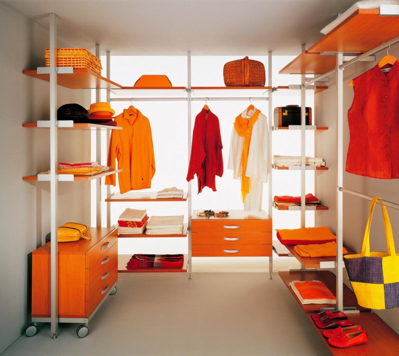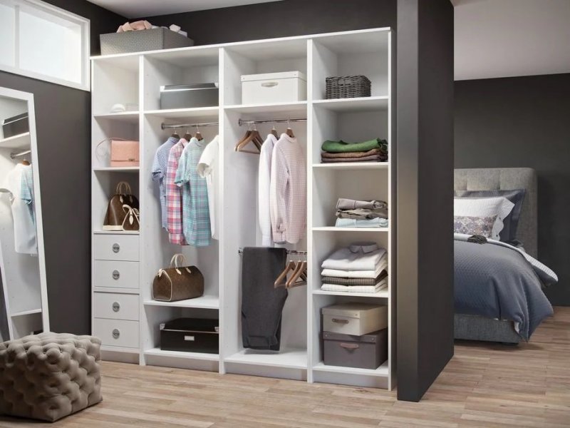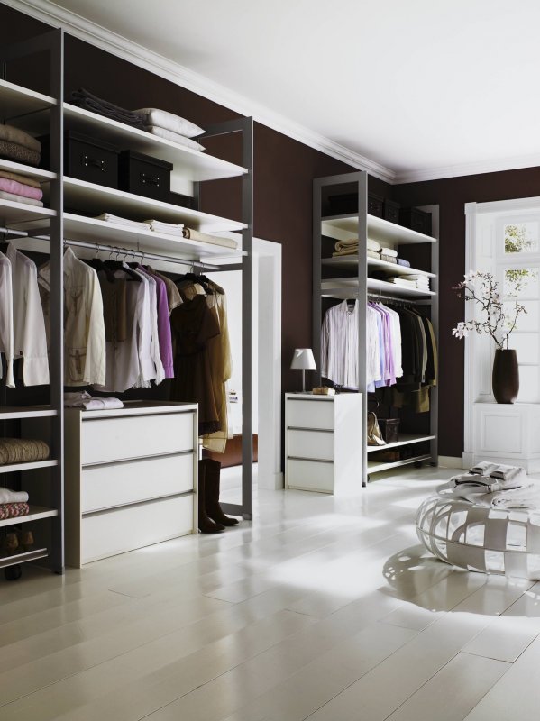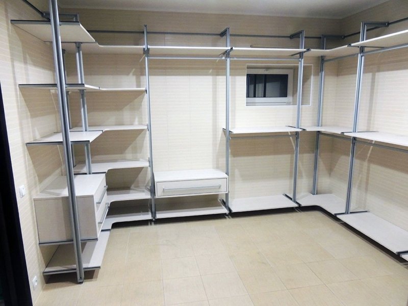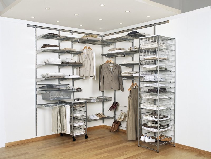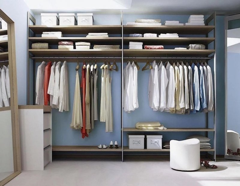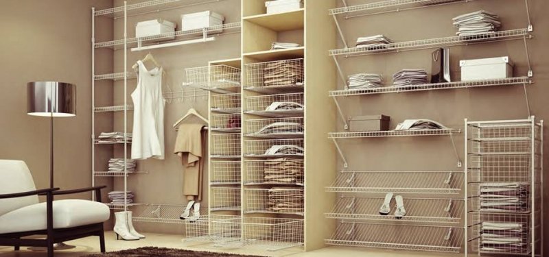 Железный каркас может быть одноуровневым или двухуровневым. Колонные системы удобны для организации зонирования гардеробной, с их помощью можно удачно делить пространство. Минусы – отсутствие ограничений на стеллажах. Открытый тип полок не убережет сложенную стопкой одежду от падения.