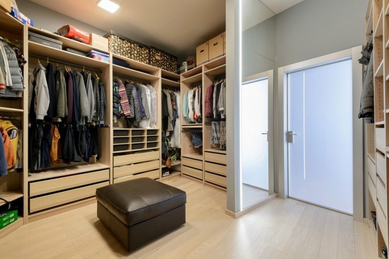 Хороший вариант для гардеробной в квартире – переоборудованные кладовки. Это помещение часто остается без функциональной нагрузки или захламлено неиспользуемыми вещами. Тут легко поместится стеллаж, несколько полок и небольшая штанга вдоль стены. Большие квартиры с улучшенной планировкой могут иметь два санузла. Если во второй уборной необходимости нет, ее можно смело переделать в гардероб.