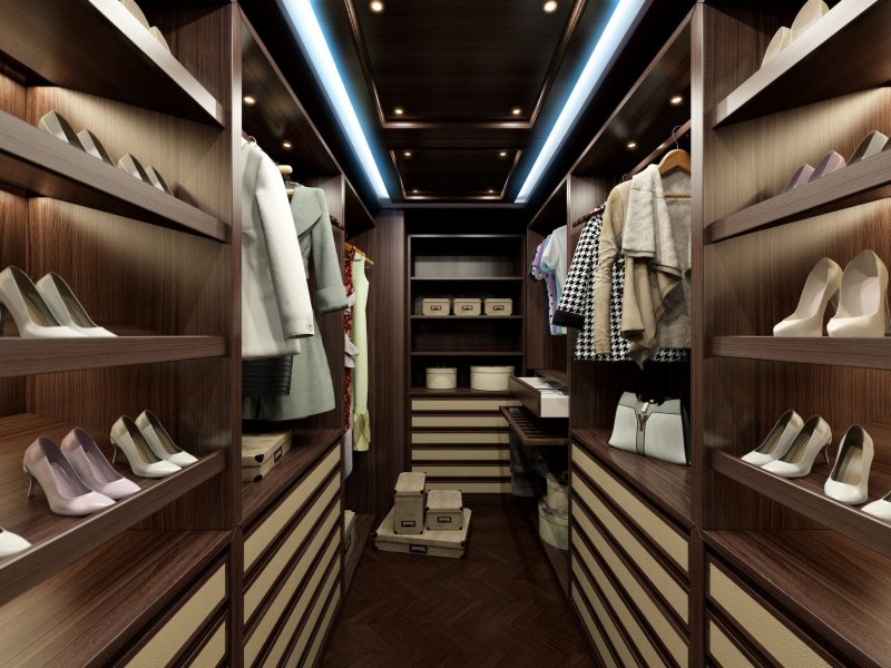 Габариты ниш и полок зависят от количества вещей и размера помещения. Если это бывшая кладовая, пространство необходимо разделить на зоны. В нижней части располагают редко используемые вещи. Этот уровень можно оборудовать выдвижными ящиками для постельного белья, пледов, сезонных покрывал или скатертей. Если эта зона будет предназначена для хранения обуви, ее оборудуют высокими полками.