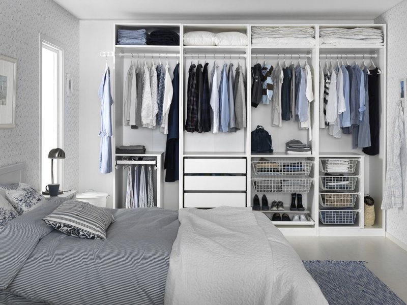 Универсальные гардеробы от IKEA отлично впишутся в помещения любых габаритов. Для них подойдет пространство в углу или вдоль стены. Простая конструкция позволяет использовать в качестве дополнения всевозможные рейлинги, штанги, корзины и ящики.