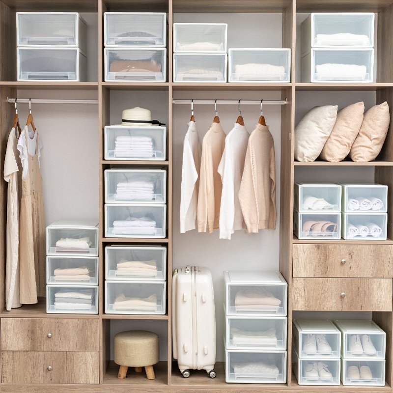 Коробки предназначены для сложенных вещей, которым не требуется глажка перед использованием. Таким способом хранят постельное белье, скатерти, полотенца для кухни и ванной, белье и прочие текстильные изделия. Короба из плотного материала устанавливаются в любое место стеллажа, полки, на полу. Для облегчения перемещения они могут иметь специальные колесики.