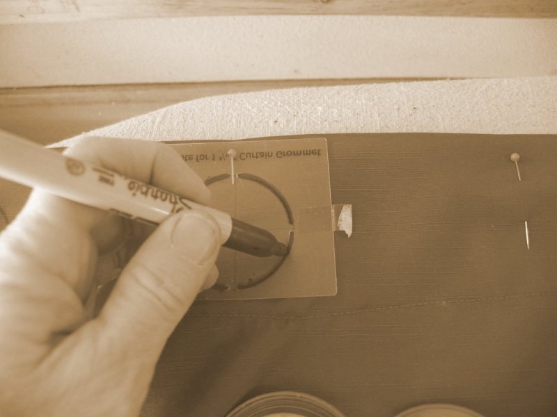 Устанавливаются детали на аккуратно подшитые шторы с уже обработанными краями. Рассчитывать точное расстояние между деталями можно так: будущую занавеску кладут на ровную поверхность, карандашом или мелком отмечают места расположения крайних люверсов. После измеряется расстояние между серединными точками двух боковых элементов, полученное число делится на количество деталей, делается соответствующая разметка.
