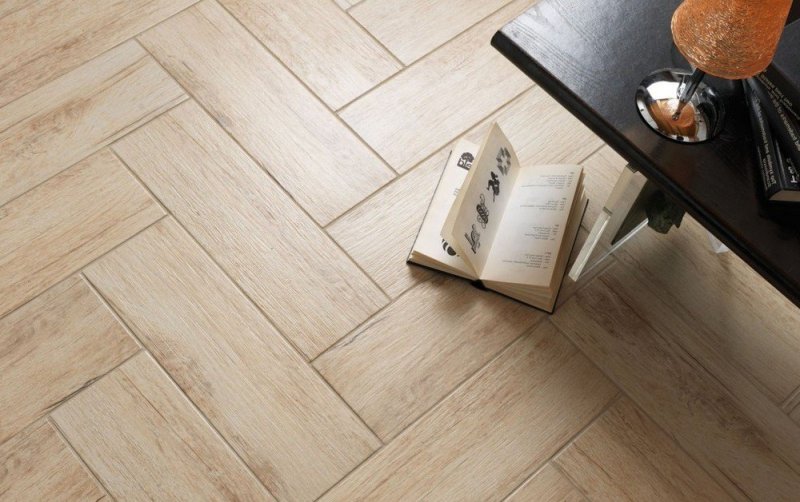 Для укладки используется плитка вытянутой прямоугольной формы с рисунком, имитирующим текстуру палубной доски. Благодаря разнообразию керамических изделий, максимально похожих на древесные материалы, можно использовать любые паркетные раскладки. Конкретно этот способ предполагает прямолинейную укладку с незначительным смещением.