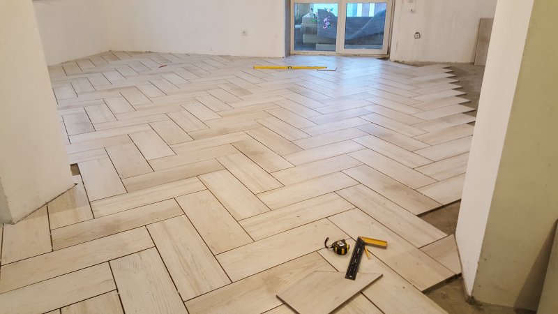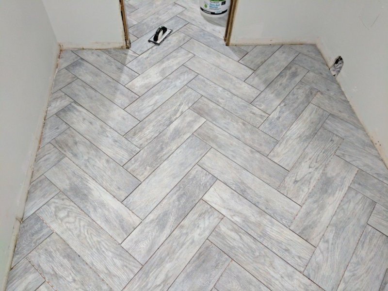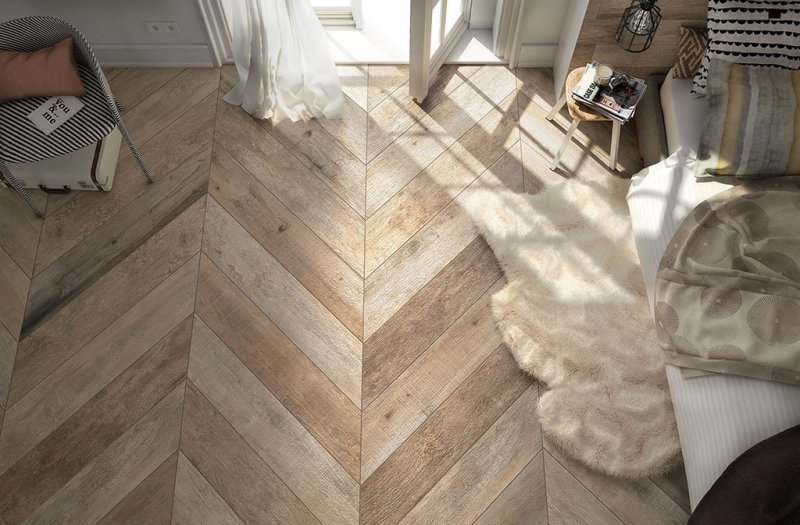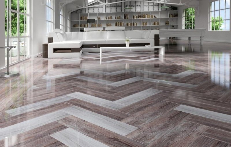 Техника кладки «елочкой» заключается в стыковке узкой стороны материала с широкой стороной другой плитки для образования углов 90 градусов. Правильно подобрав узор, можно сделать прочный плиточный пол с имитацией рисунка ламината, паркета. Такой способ применяют для облагораживания комнат неправильной формы, поскольку рисунок создает оптическую иллюзию и сглаживает разницу в размерах помещения.