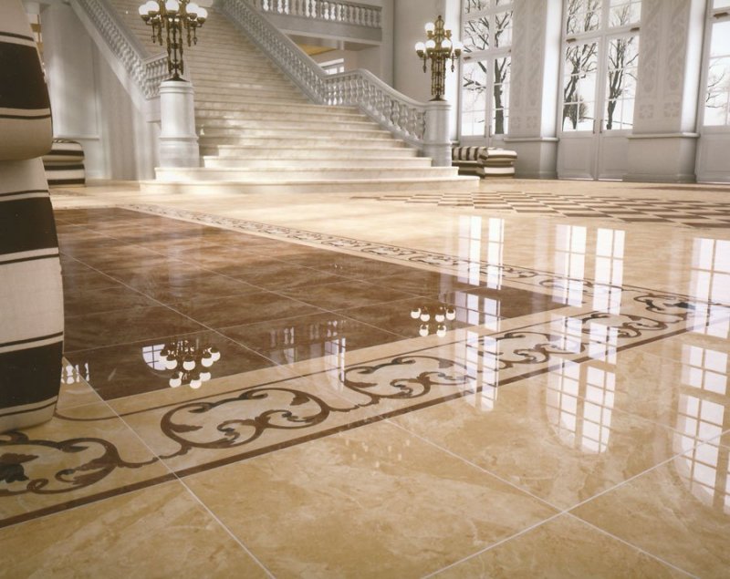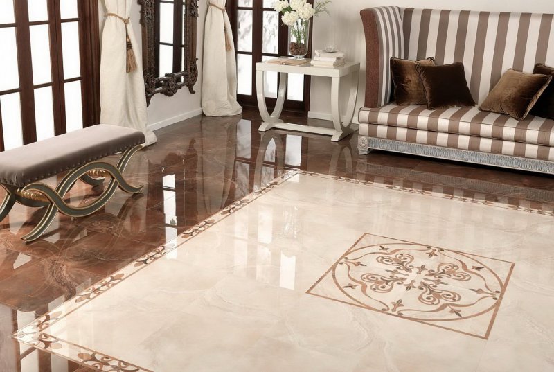 Для создания рисунка из кафеля используют минимум три цвета. Сначала создают эскиз. Если все размеры совпадают по площади с помещением, переносят его на прозрачную бумагу для выкроек и размечают подготовленную поверхность. Затем прямо на полу собирается кафельная облицовка из множества простых и фигурных деталей.