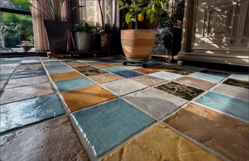 Отличный способ, чтобы создать средневековую атмосферу или скрыть некрасивый уклон комнаты. В рисунке «калейдоскоп» принимают участие одинаковые по размеру элементы, но различные по цвету. Если плоскость большая, лучше выбирать оттенки из одного спектра, максимум можно прихватить соседние. Главное – чтобы контраст получился мягким. Необходимо, чтобы пропорциональное количественное соотношение всех плиток было одинаковым. Для этого общее количество участвующих модулей делят на количество цветов.