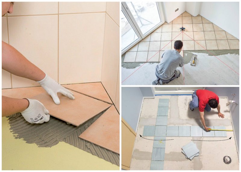 Укладывать материал можно только на ровный чистый пол, дверные наличники и плинтус надо снять. Работать проще по направляющим линиям. Образовавшийся зазор между крайним рядом кафеля и стены можно скрыть плинтусом или придется приклеить керамическую полосу.