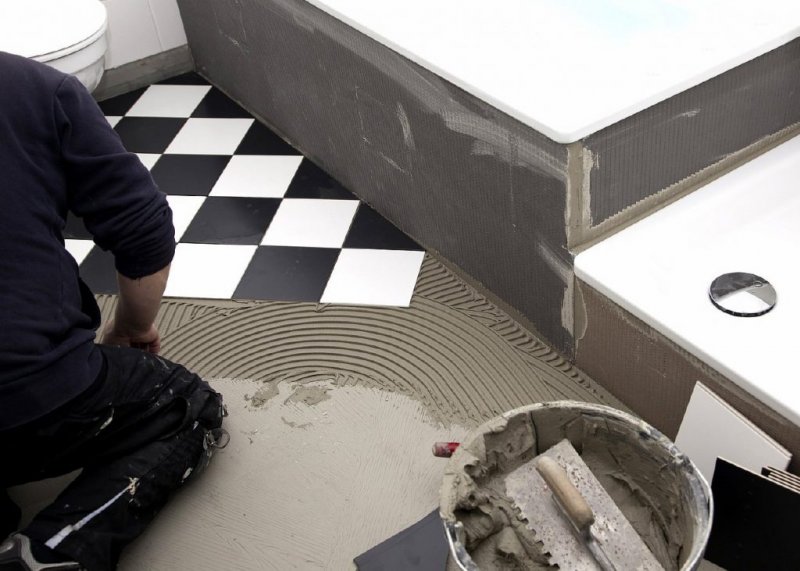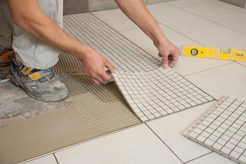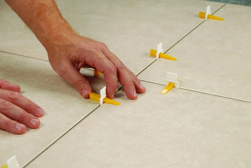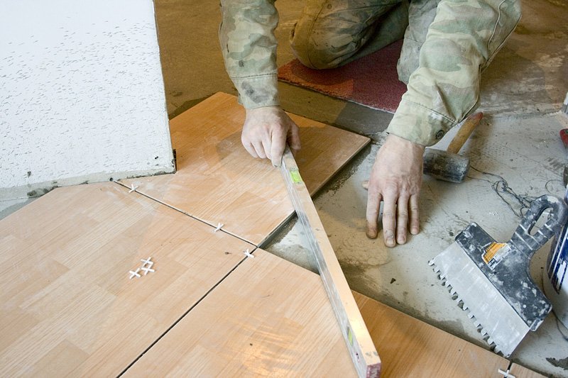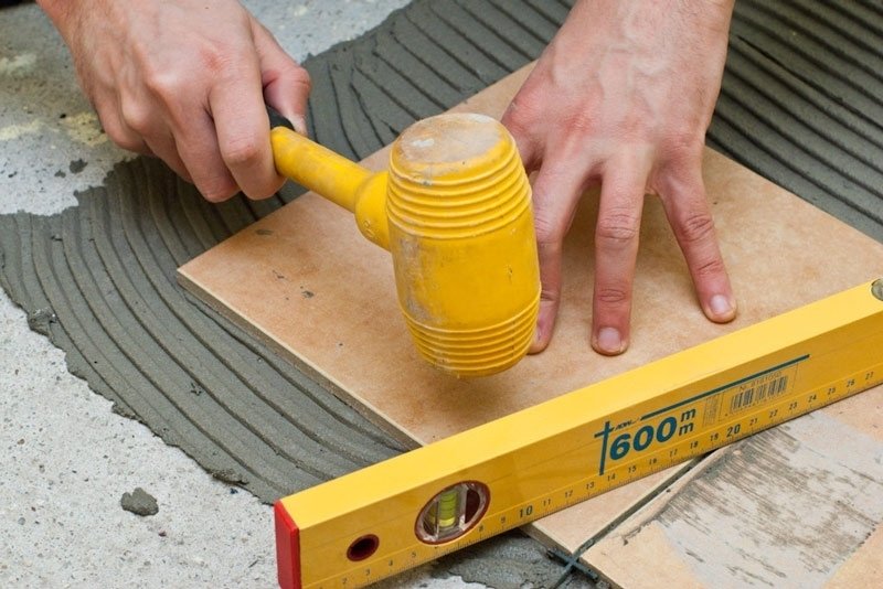 Перед тем как приступать к выкладке плитки, надо обязательно определить уровень пола. Для этого по углам выкладывают маячные плиты, делают стяжку. При необходимости плитку ровняют с помощью резинового молотка.