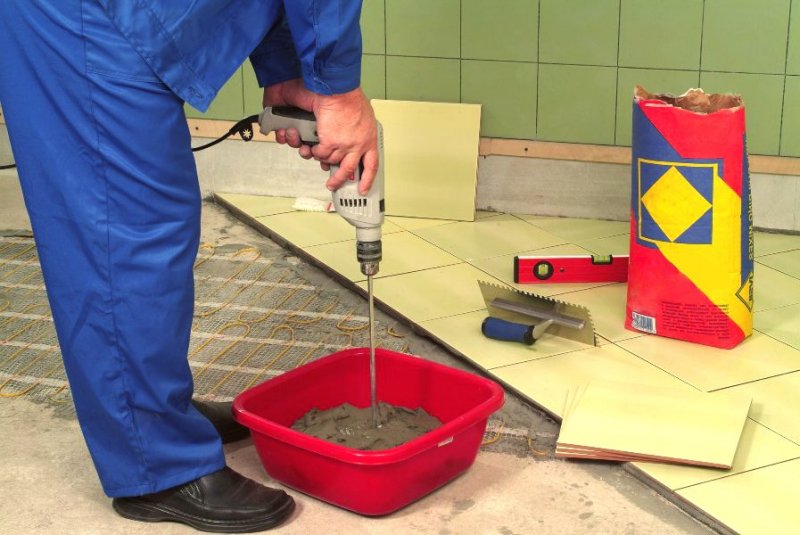 Для смешивания сухой меси в домашних условиях понадобится два ведра – одно пустое, второе с водой, сухой плиточный клей, строительный миксер. В пустую емкость наливают 2-а литра воды, засыпают соответствующее инструкции количество сухого клея, опускают миксер в массу и смешивают на самой маленькой скорости. Добиться требуемой консистенции можно путем добавления жидкости или порошковой смеси. Чтобы раствор стал однородным и пластичным, ему надо постоять 10-15 минут.