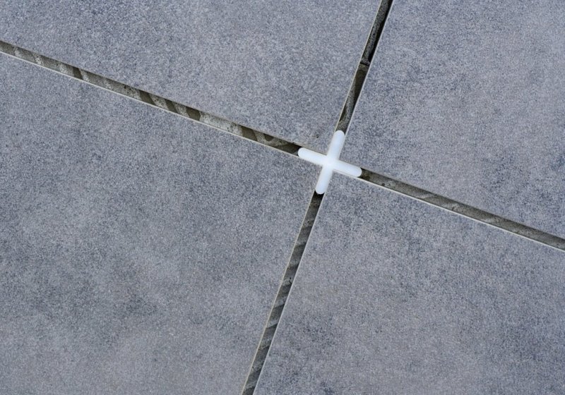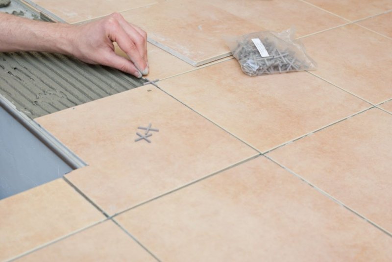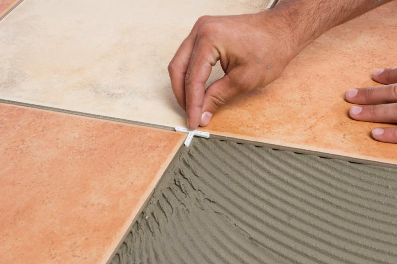 При облицовочных работах в каждое плиточное перекрытие помещают пластиковые крестики. Их зажимают между плашками для соблюдения идентичного расстояния между ними. Они будут там находиться до полного высыхания клея.