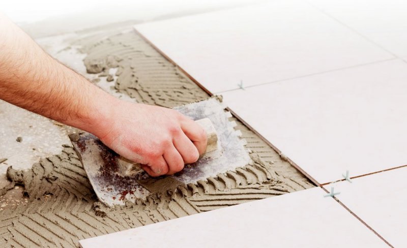 Перед укладкой плитки на бетонную основу надо нанести гидроизоляцию, особенно если помещение будет подвергаться воздействию влаги. Это может быть рулонная самоклеящаяся пленка или битумная мастика. Сам процесс укладки плитки проходит с помощью специальных пластиковых крестиков для швов. Готовый клей наносят на бетон и на саму облицовку зубчатым шпателем, соединяют материалы и слегка придавливают.