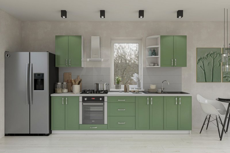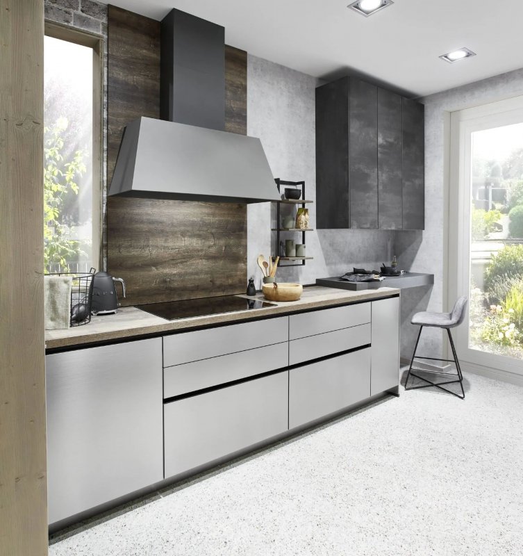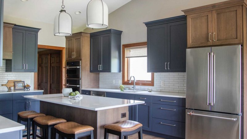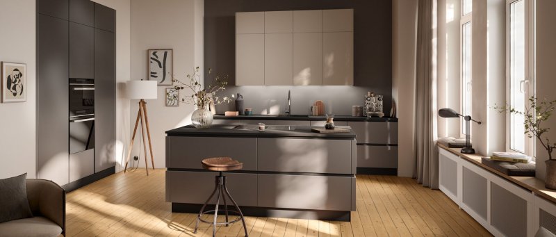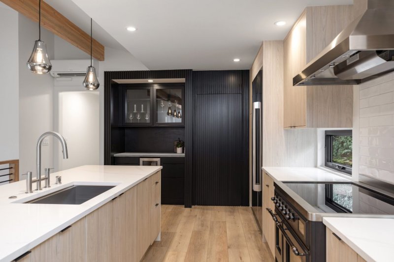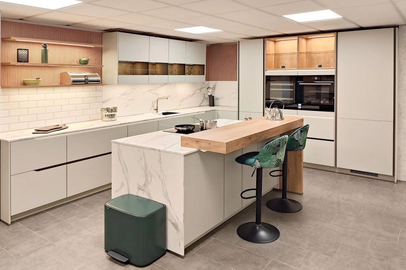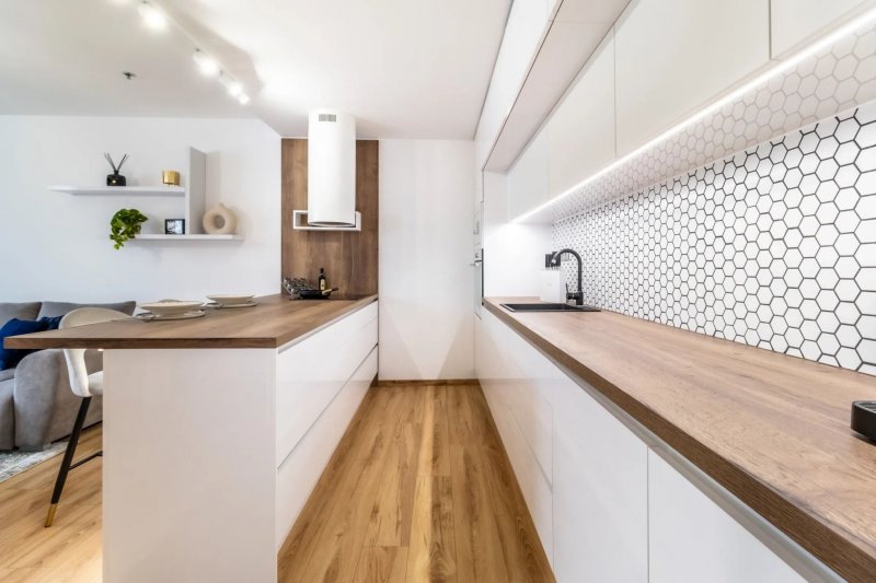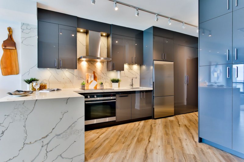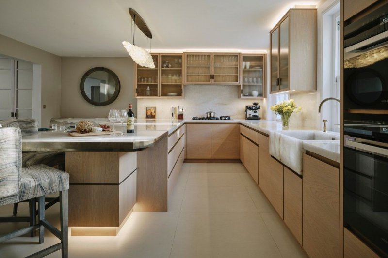 Используются гладкие фасады шкафов без ручек, встроенная техника и лаконичные линии. Чтобы избежать «стерильного» эффекта, добавляют теплые материалы: древесину, натуральный камень, латунь.