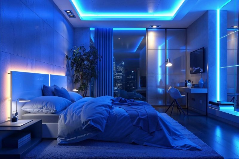 Подсветка регулируется по времени суток, создавая эффект естественного света. Популярны встроенные светильники в изголовье кровати или за панелями.