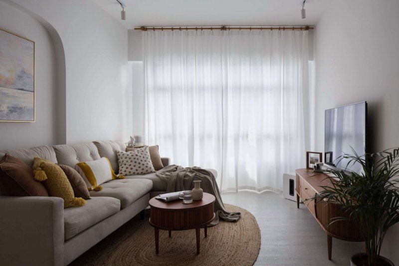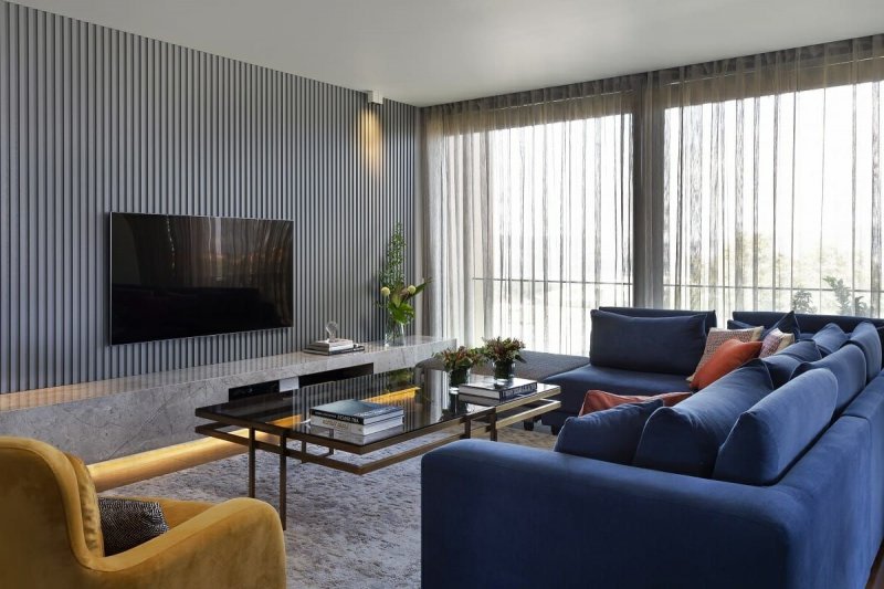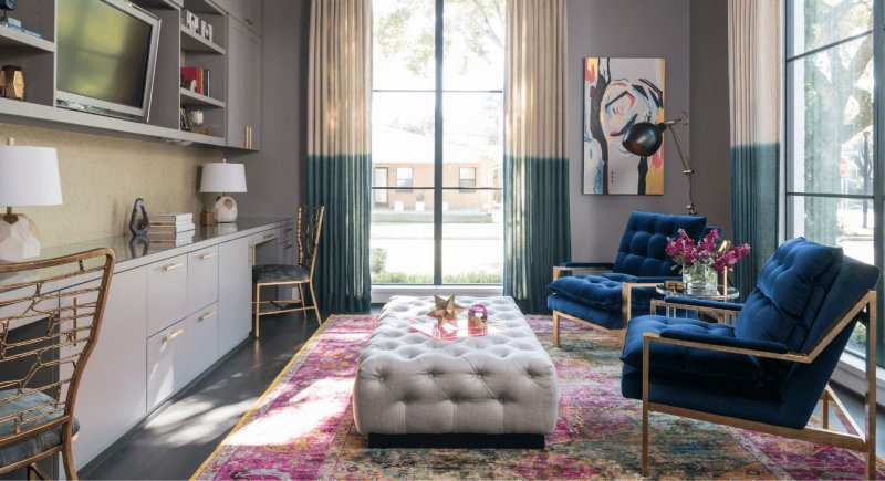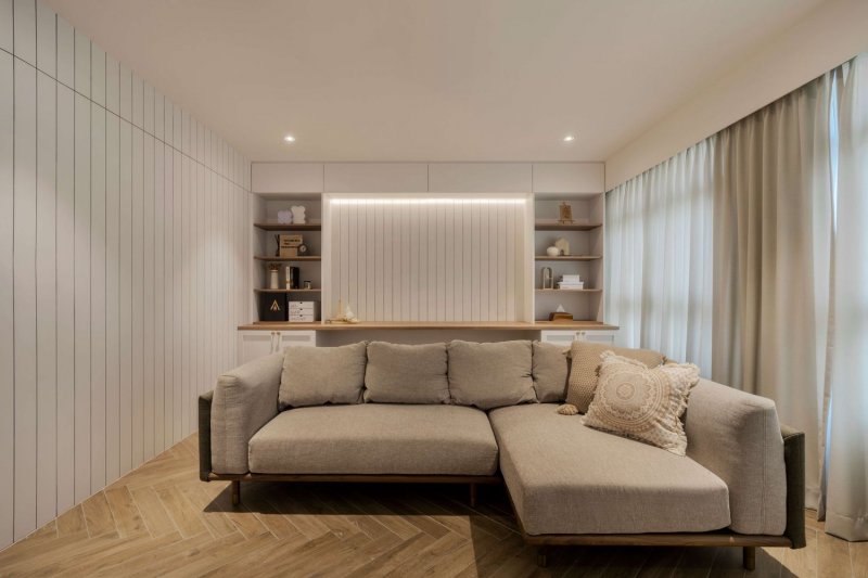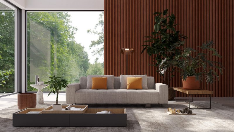 В моде тяжелые шторы изо льна, бархатные подушки и ковры с абстрактными узорами. Также активно используются декоративные панели из ткани, создающие уют и поглощающие шум.