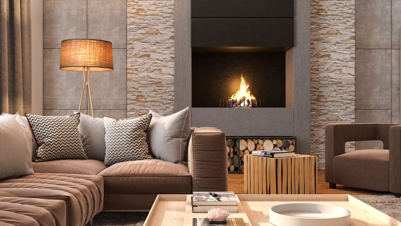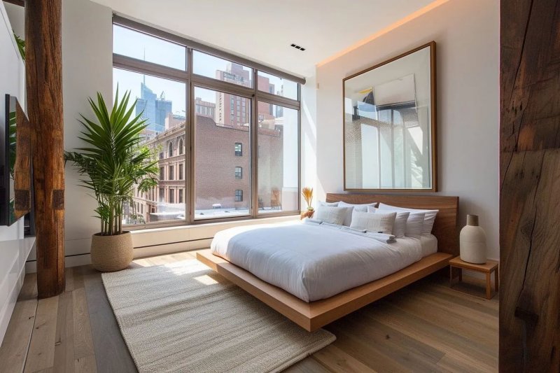 В отделке преобладают природные материалы: дерево, камень, лен и шерсть. Популярны большие комнатные растения, создающие ощущение единения с природой.