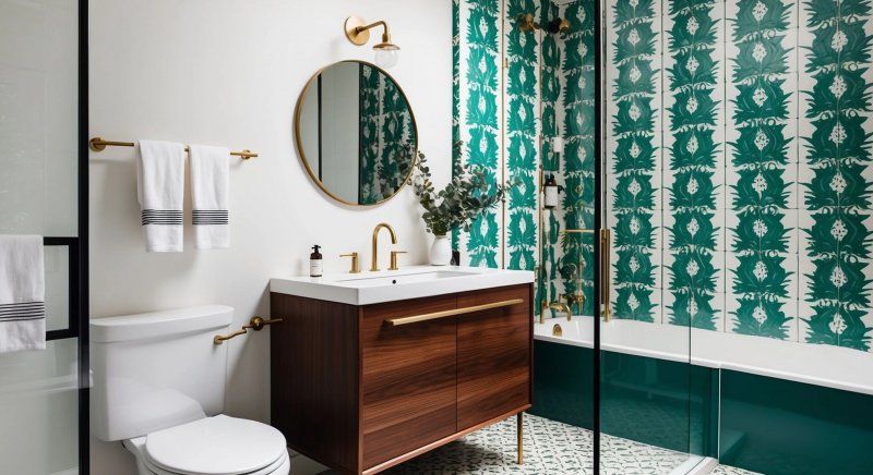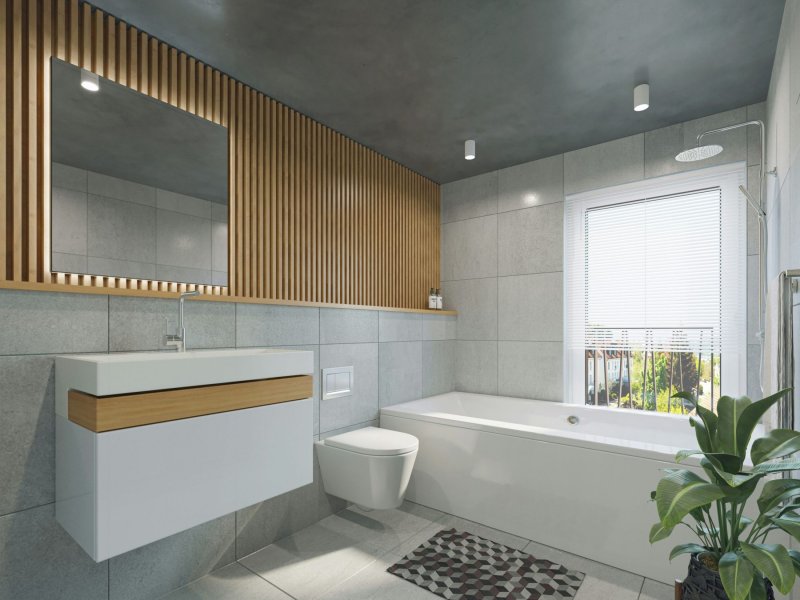 Дизайн сантехники ориентирован на минимализм: чистые линии, встроенные смесители и лаконичные формы создают визуальную легкость. В тренде матовые оттенки – черный, графитовый и латунь. Завершающий штрих – серо-зеленые акценты в сочетании с мягким освещением.