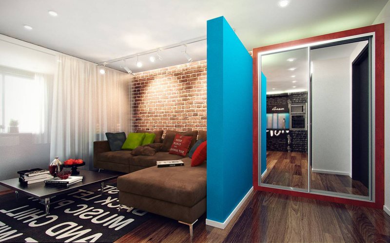 Также подойдут вместительные шкафы-купе, за дверками которых можно разместить много вещей. Для отдыха и приема гостей подойдет комфортный диван с декоративными подушками.