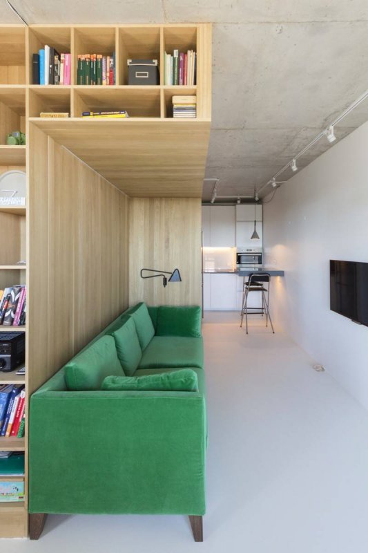 Любите смотреть фильмы? Установите на одной из стен большой телевизор, а напротив него комфортный диван, дополненный подлокотниками-трансформерами: под ними находится пространство для мини-бара, а сами подлокотники могут трансформироваться в небольшой столик.