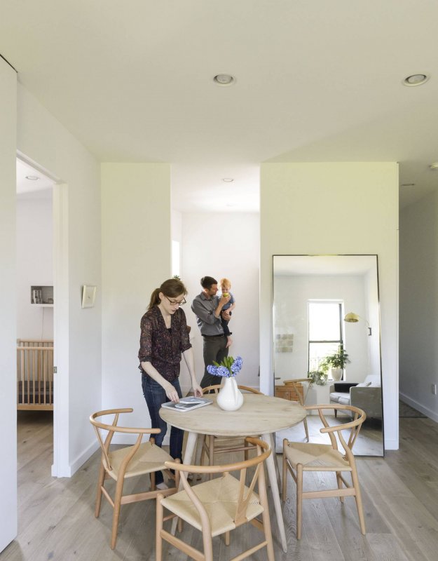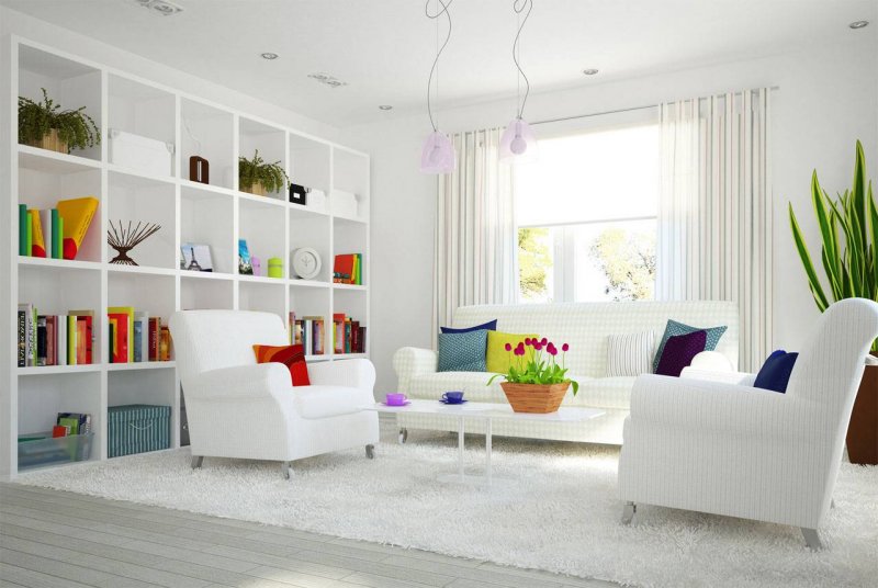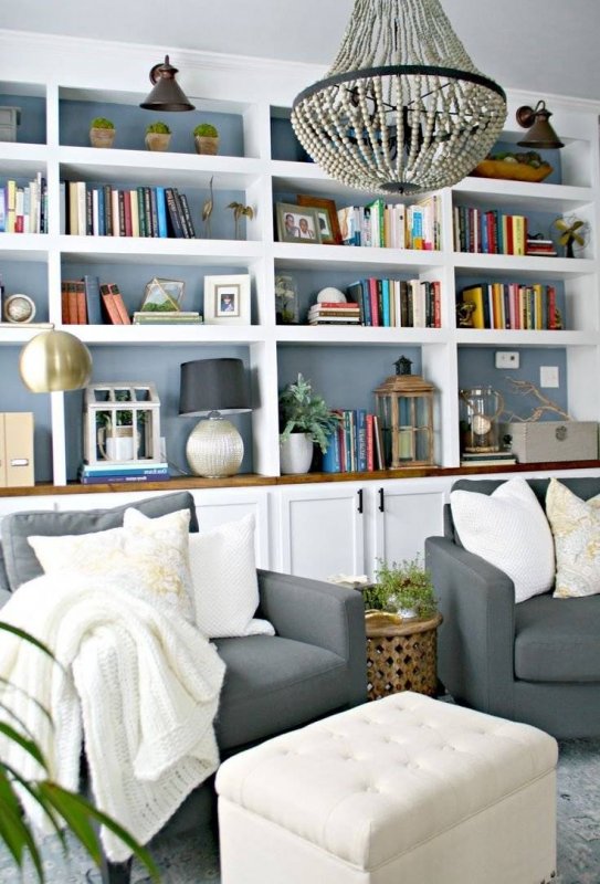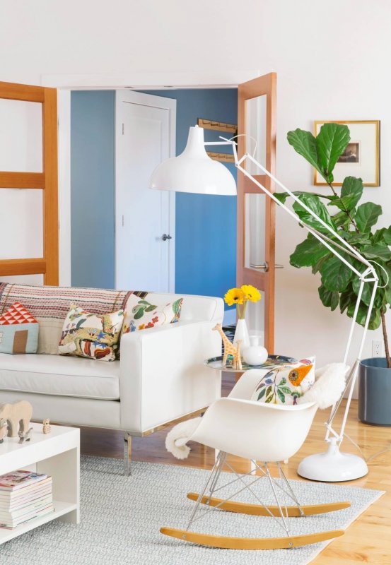 Лучше больше вещей поместить в кладовую или на стеллажи, а в помещениях поставить легкую и компактную мебель. Это хорошее решение для интерьера комнаты для молодой семьи.