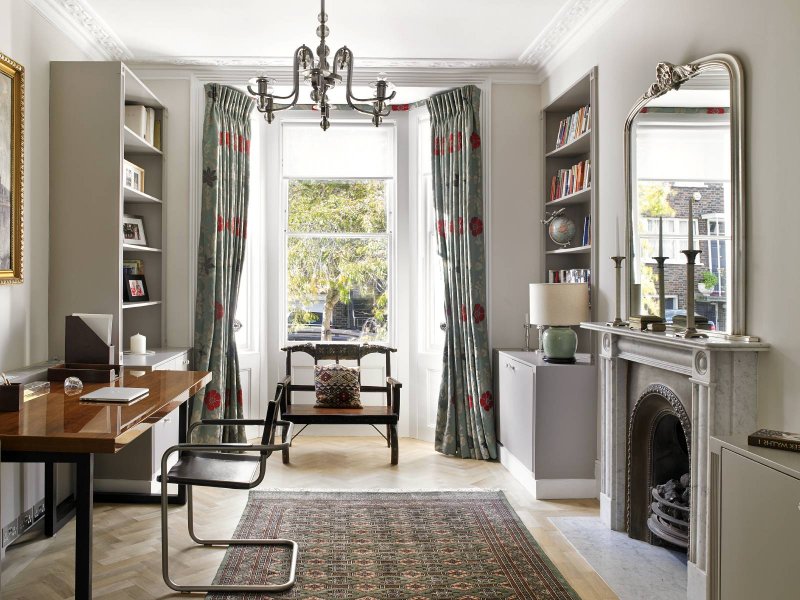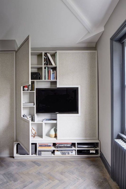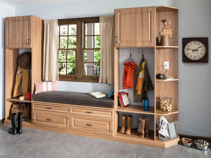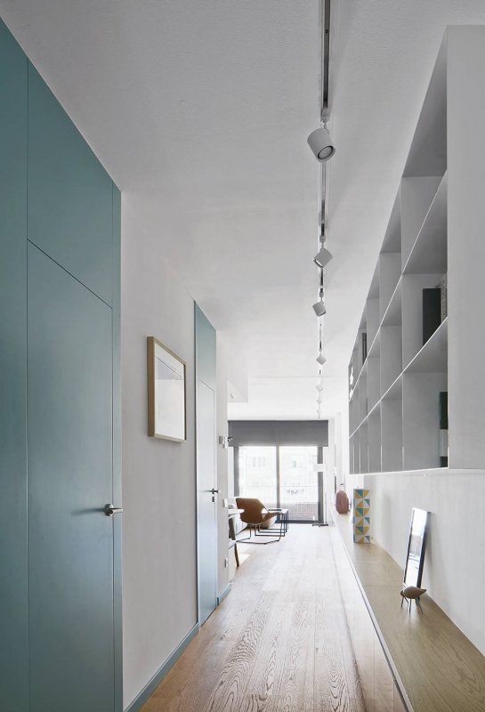 Вдоль одной из его стен установите шкаф-купе. Длинные стеллажи позволят хранить немало вещей, которые скроют дверки шкафа.