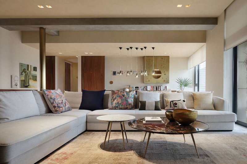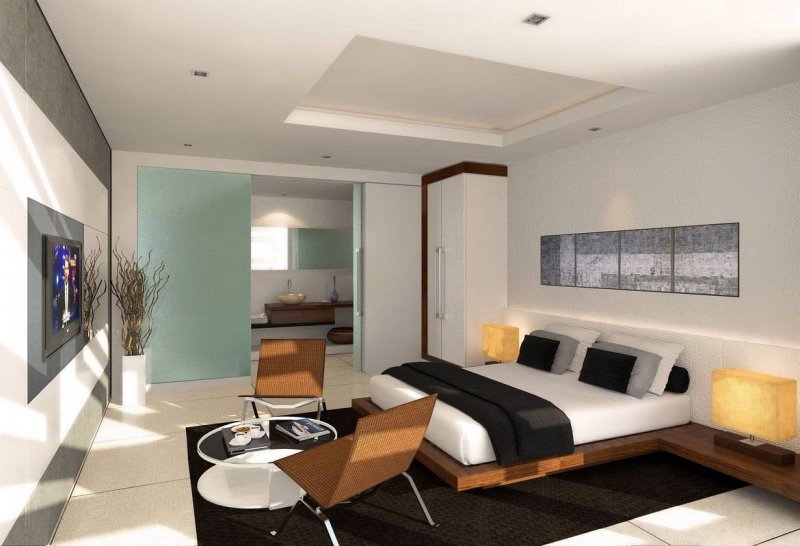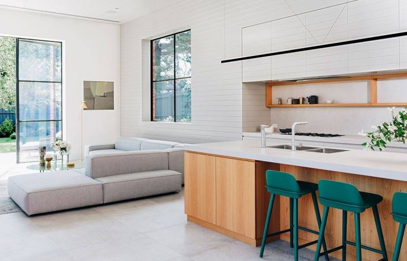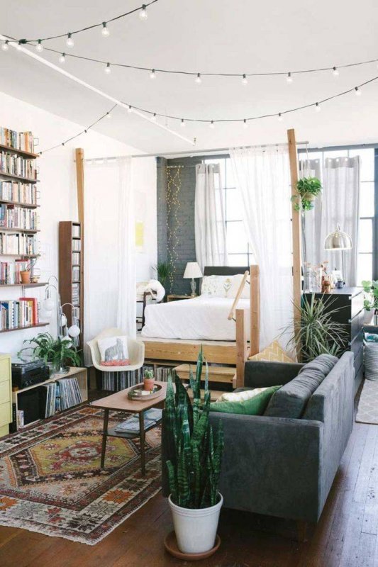 Нередко дизайнеры используют такое решение: кухня и гостиная объединены, а зона для сна отделается ширмой или перегородкой.