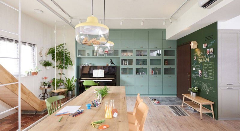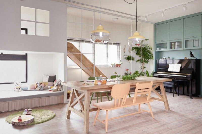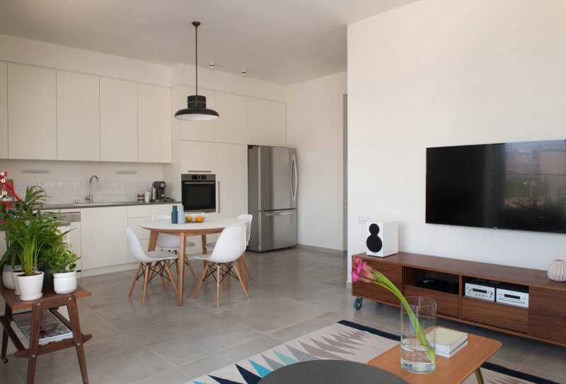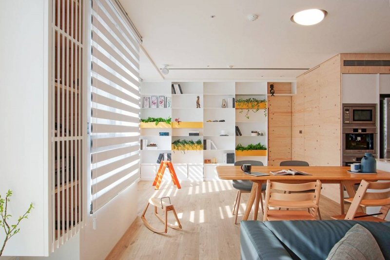 Есть и компромиссное решение – студия, но с отведенной одной или несколькими комнатами. В результате такой интерьер квартиры для семьи с ребенком будет включать в себя просторное помещение в виде кухни-гостиной и отдельные комнаты для спален.