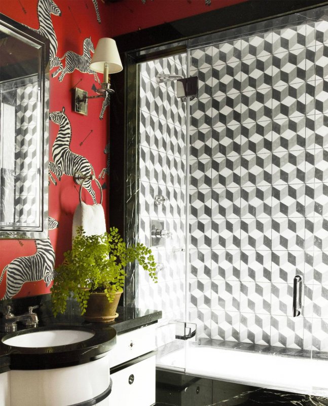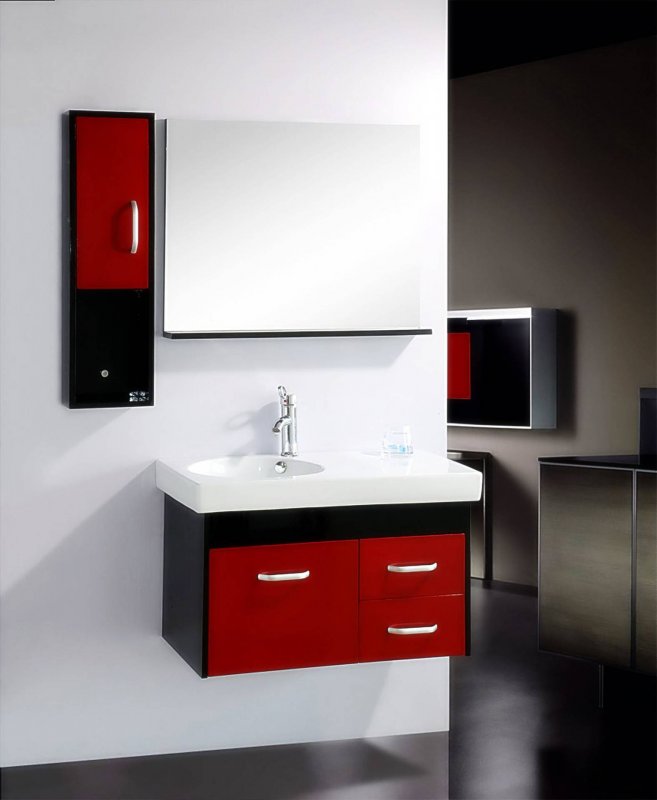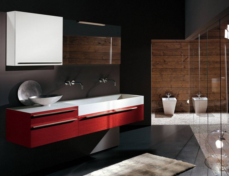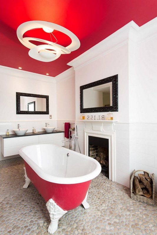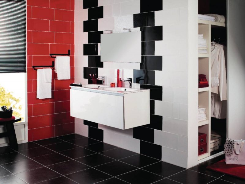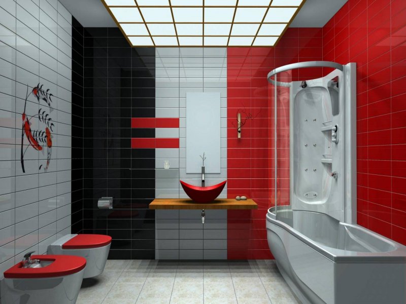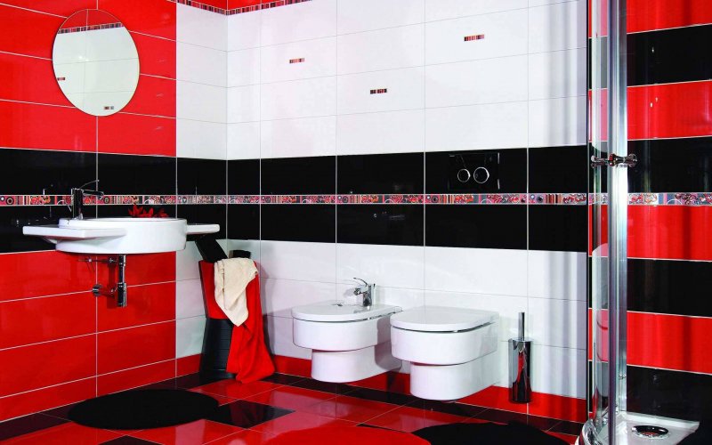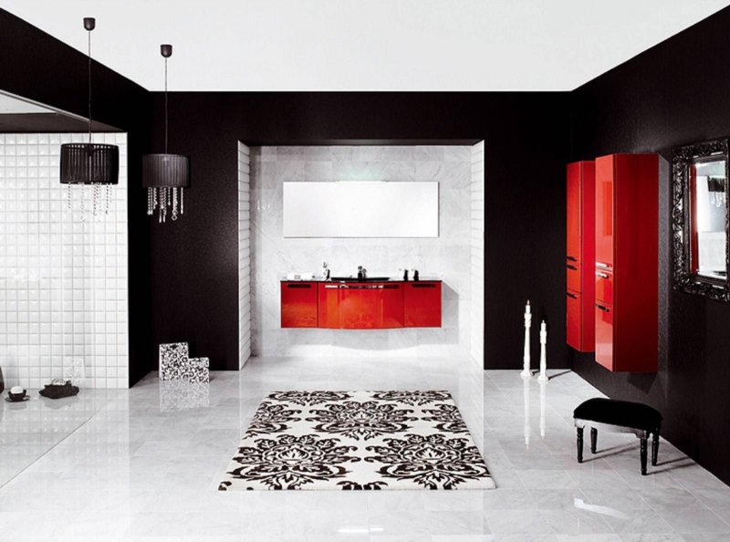 Лучше всего в ванной комнате черно-красного цвета сделать главным красный. Например, стены и крупные предметы сделать красного цвета, но разных тонов, а пол – черного. Но при этом стоит ввести третий цвет, чтобы разбавить насыщенность. С такой задачей удачно справится белый.