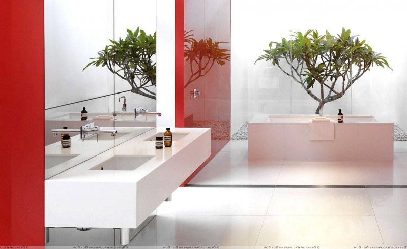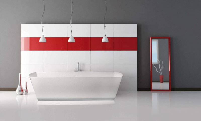 Красно-белый дизайн ванной будет эффектно выглядеть, когда доминирует белый. В таком случае красным выделяют крупные детали и акценты. Стильное и нестандартное решение – красная сантехника на фоне белых стен с небольшими вкраплениями красного.