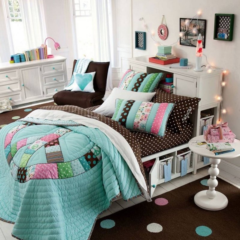 Например, в интерьер спальни для девушки можно поместить кровать с выдвижными ящиками для вещей, расположенными снизу ложа. Вместо маленьких прикроватных столиков можно использовать тумбы.