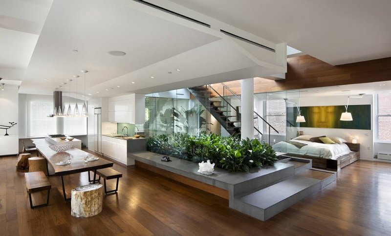 Такое решение нередко достигается за счет демонтажа перегородок, замены межкомнатных дверей на арки, увеличения оконных проемов, создания второго света в двухэтажных жилищах.