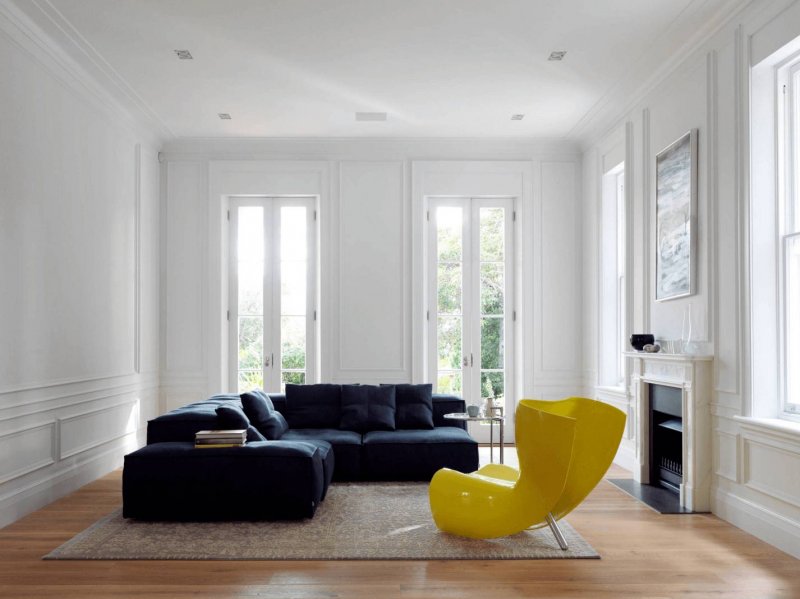 Выделить ярким цветом один или несколько объектов. Например, интерьер гостиной в стиле минимализм подчеркнет яркое кресло или торшер с ярким абажуром. Чаще всего в качестве ярких вкраплений дизайнеры выбирают зеленый, красный или желтый цвет.
