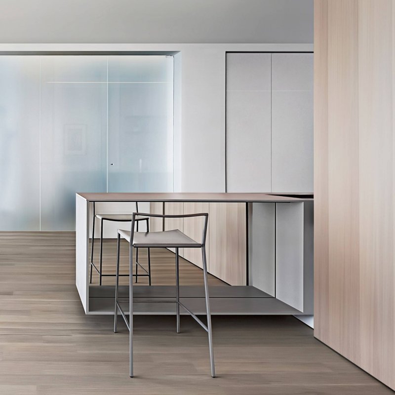 Минимализм в интерьере кухни подчеркнет барная стойка вместо большого обеденного стола. Если стол и используется, то он небольшого размера, как в маленьком летнем кафе.