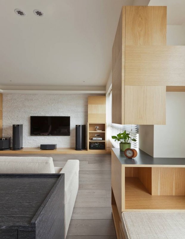 В гостиную можно поставить одно крупное комнатное растение. Японский минимализм в интерьере можно подчеркнуть бумажным веером, свитком с иероглифами, изображением сакуры или растением бонсай.