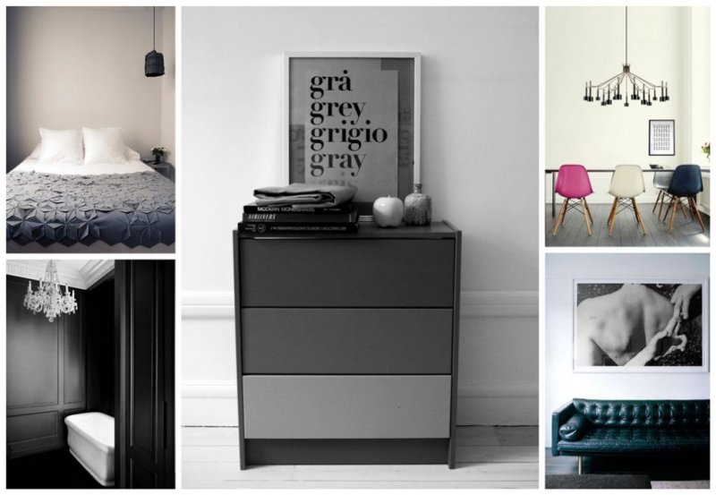 Чаще всего задействуются такие цвета: белый, серый, черный, бежевый, серебристый. Дополнить их может один яркий цвет: зеленый, желтый, красный и т. д.