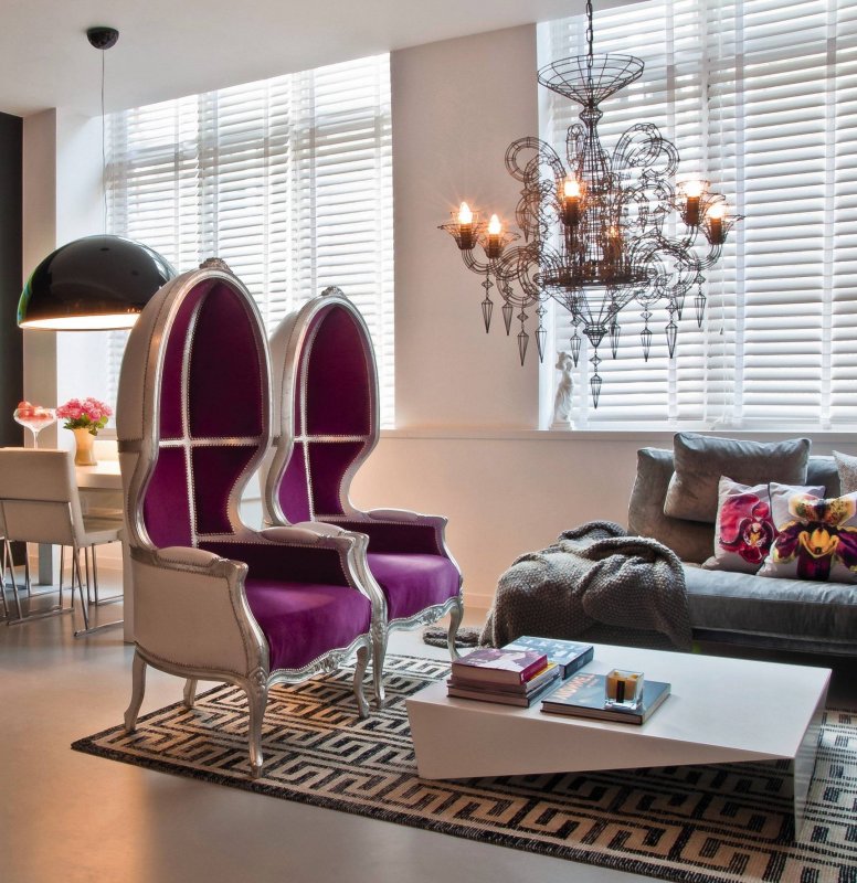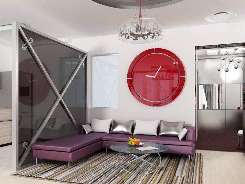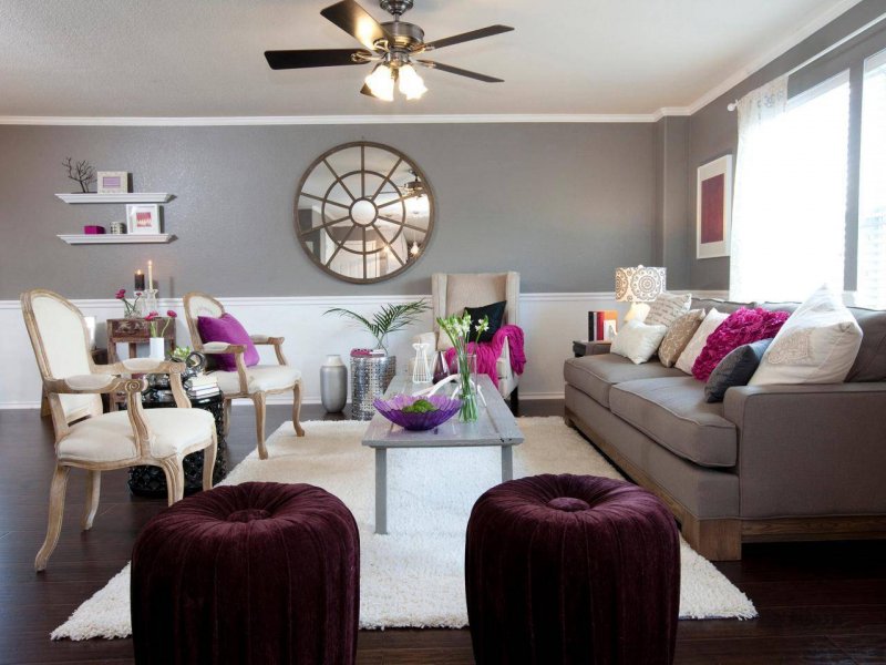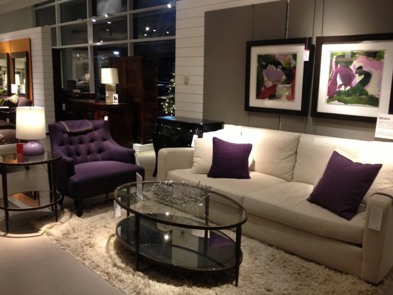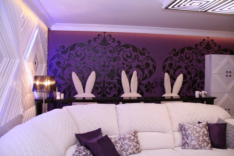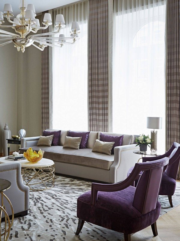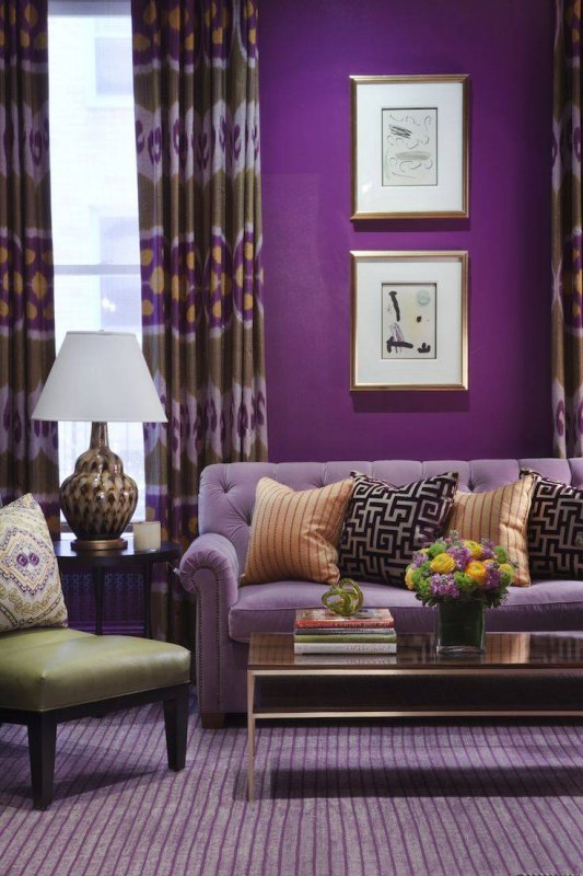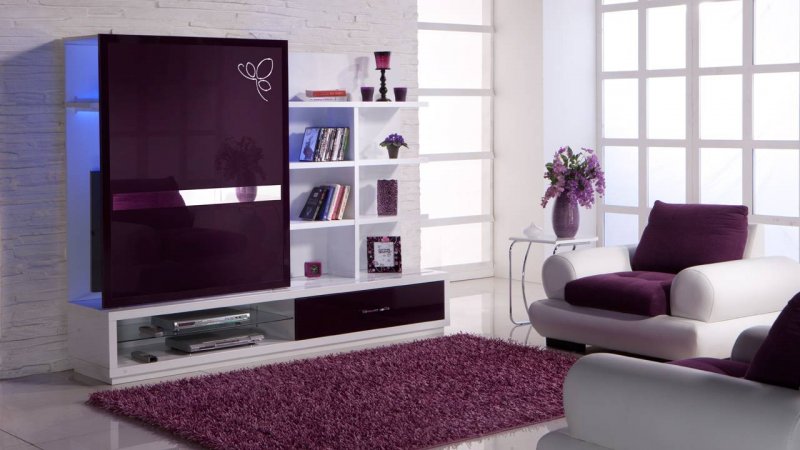 В гостиной фиолетовый удачно комбинируется с белым, черным, серебристым, зеленым.