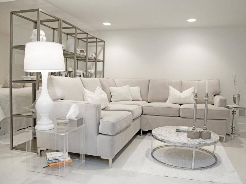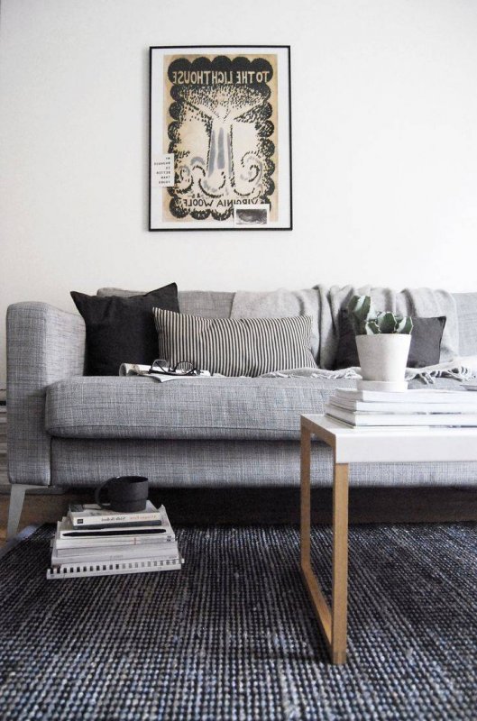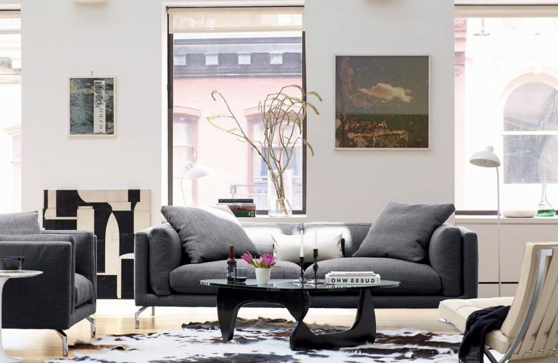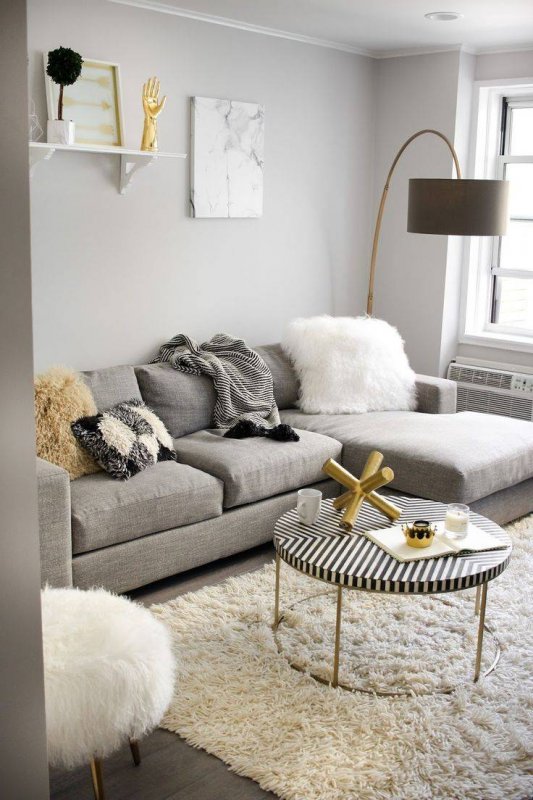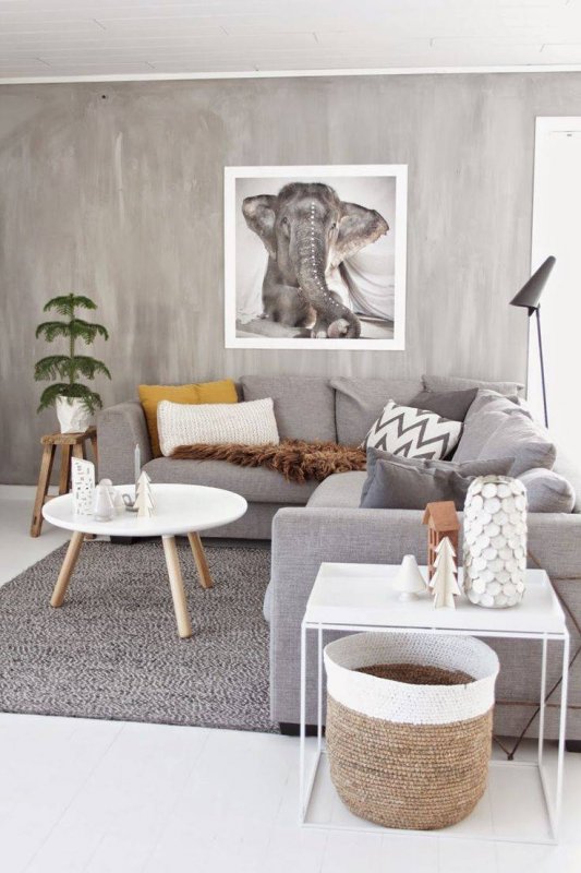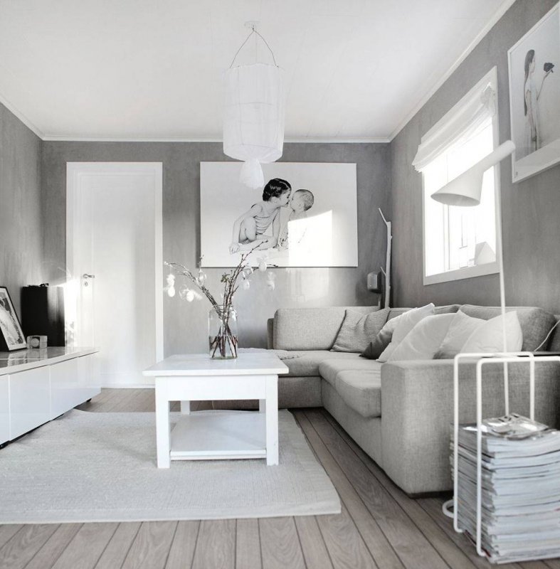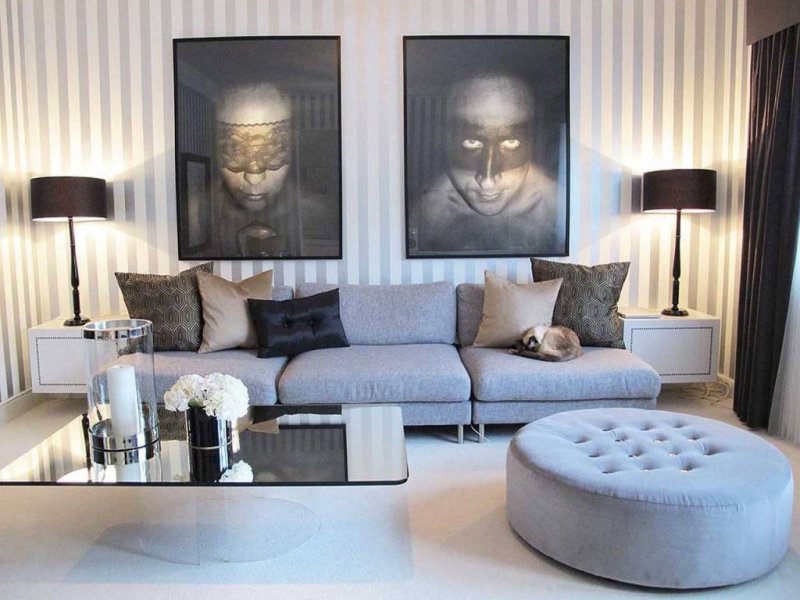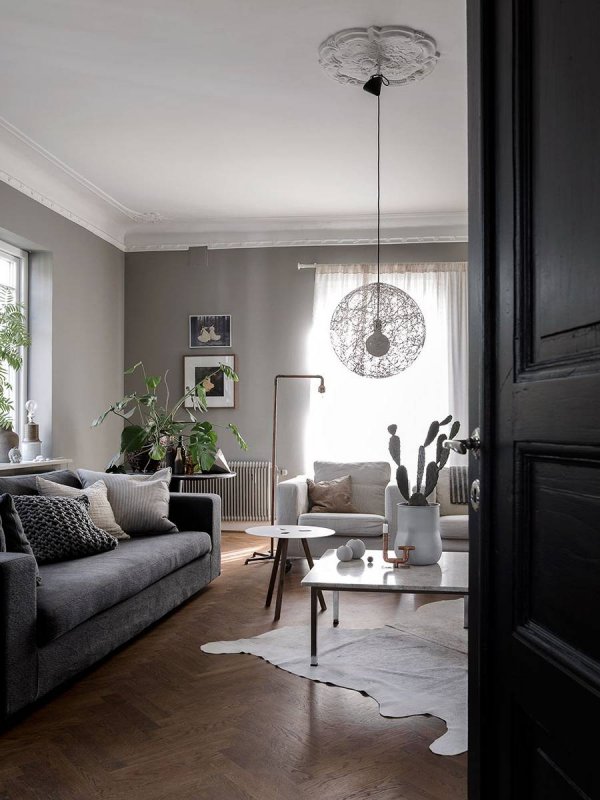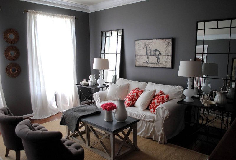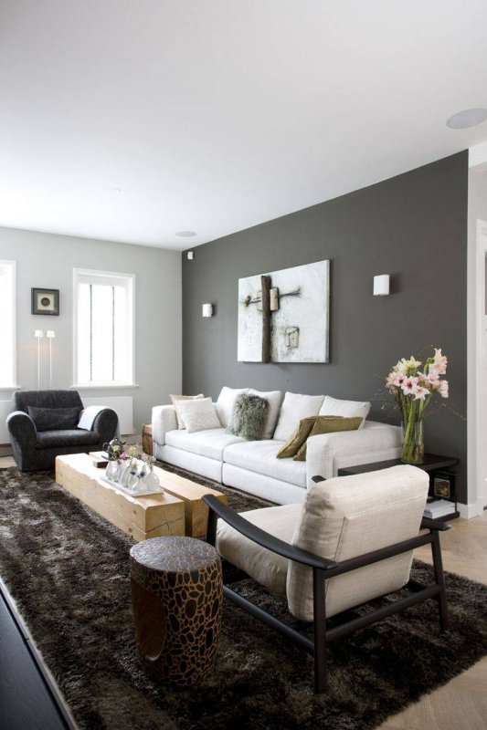 Если вы решили создать гостиную в серых цветах, сделайте доминирующими светлые и ближе к серебристому оттенки, и не забудьте про яркие вкрапления. Эффектный дизайнерский прием – помещение в серых тонах (как черно-белое фото) и один яркий предмет мебели, например, насыщенно розовый диван или кресло.