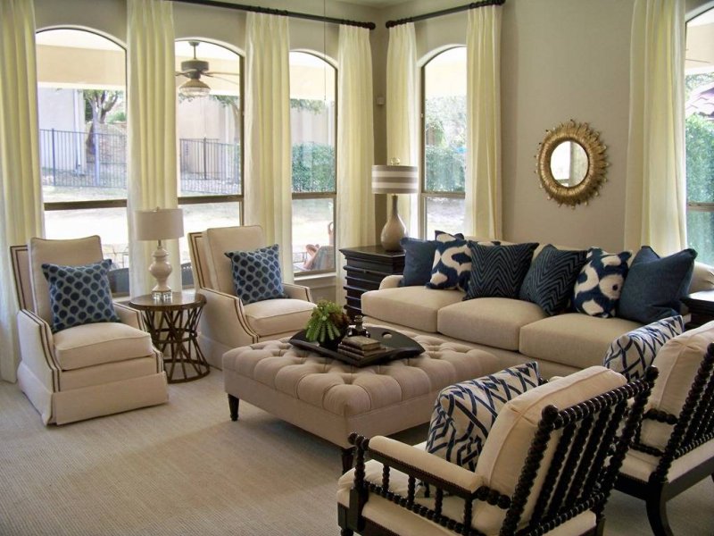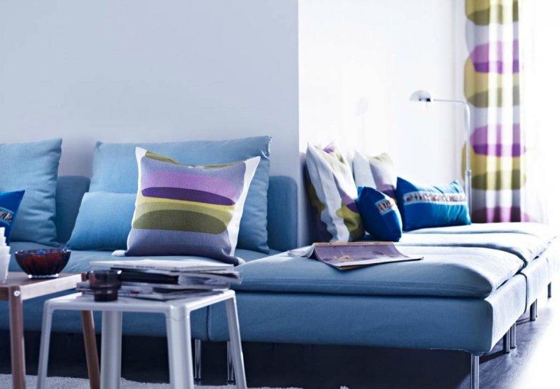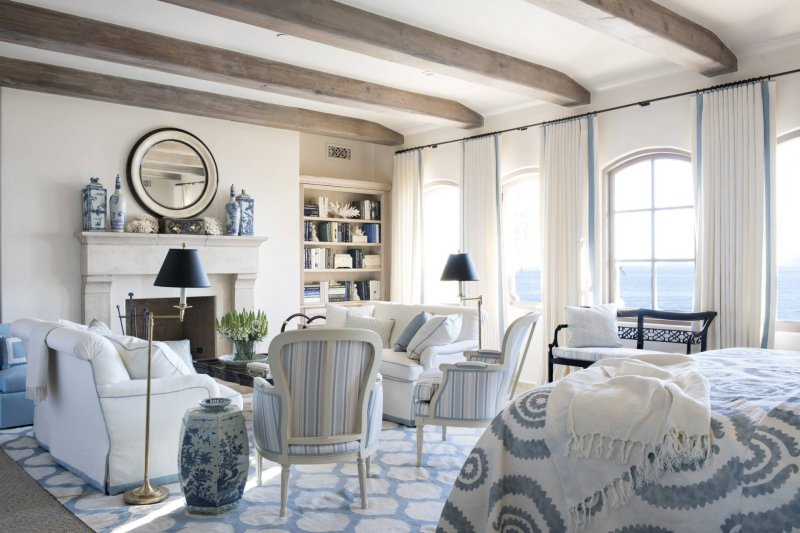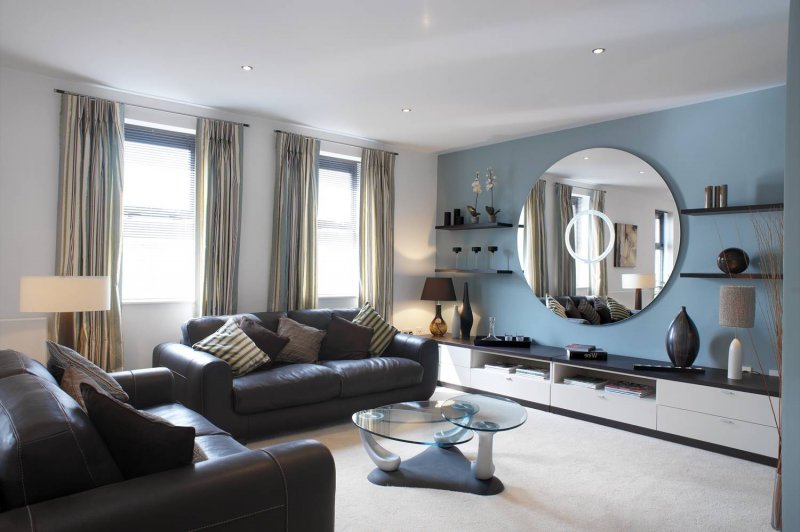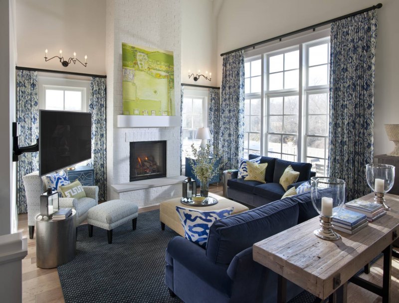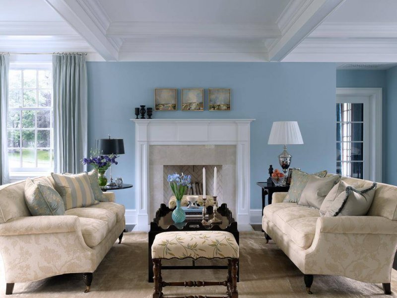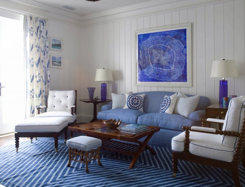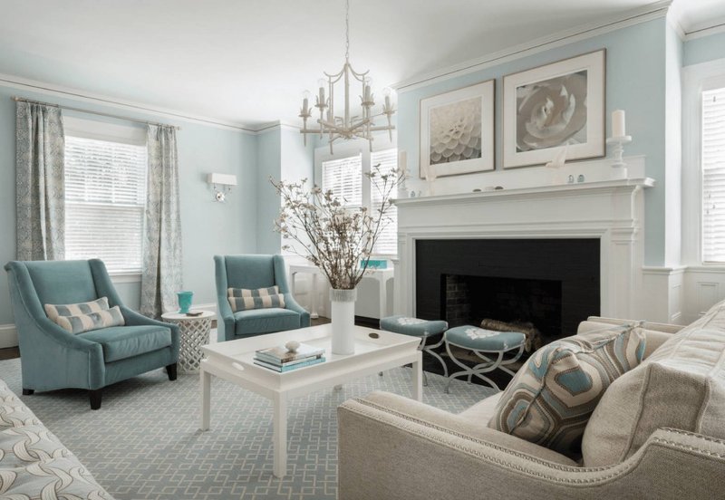 Гостиная в голубом цвете излучает свежесть и дает ощущение бодрости. Голубой – важный инструмент в руках дизайнера, если нужно реализовать средиземноморский, северный или морской интерьер. Для создания средиземноморского стиля голубой сочетают с синим, белым, оливковым, зеленым.