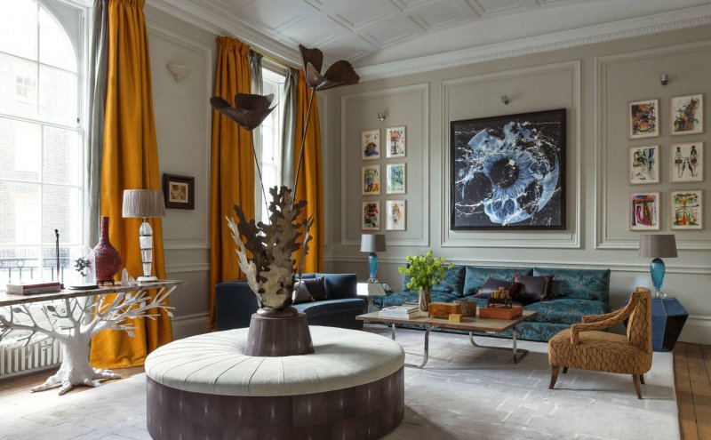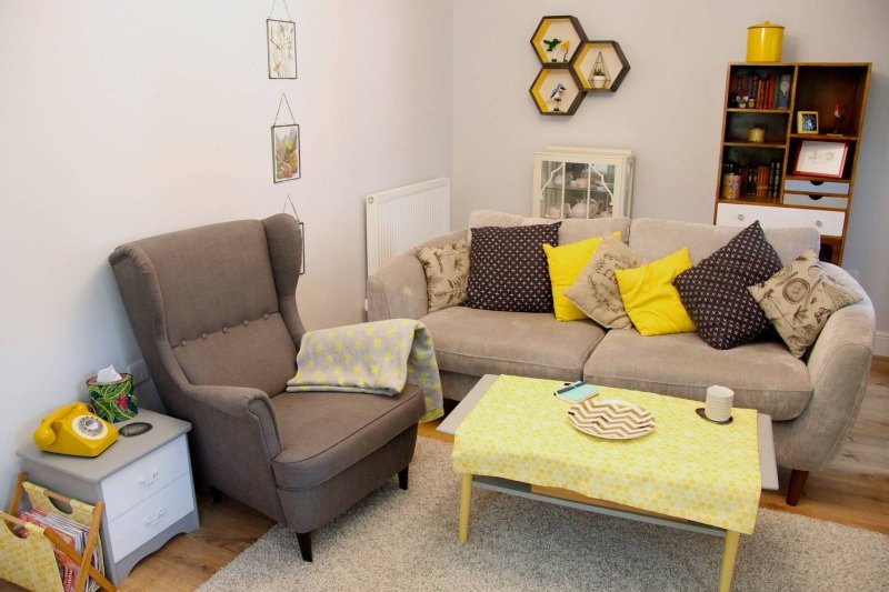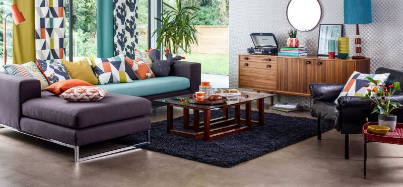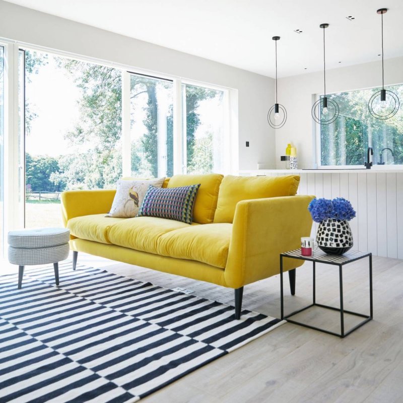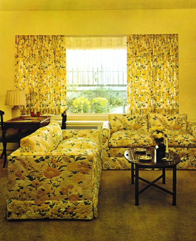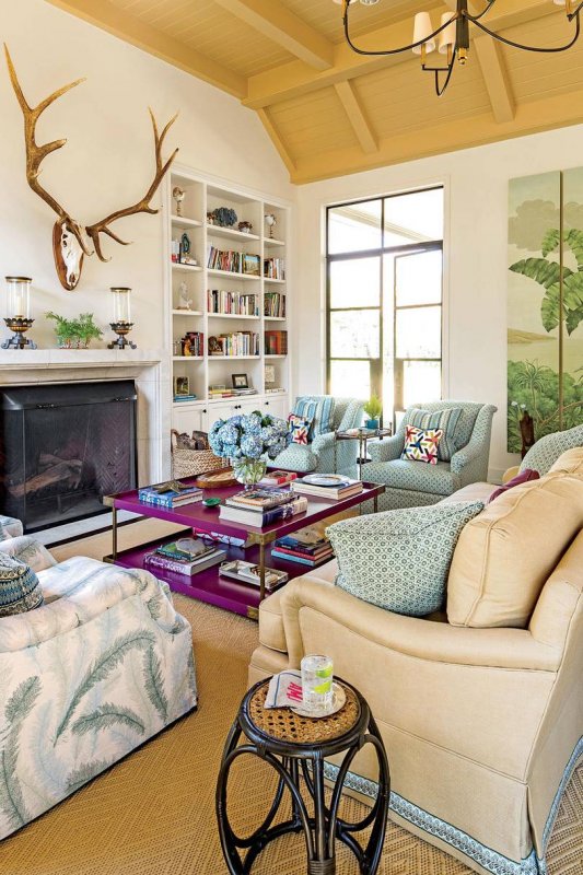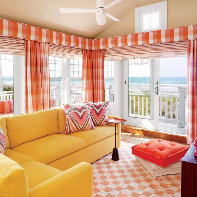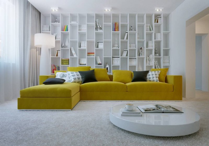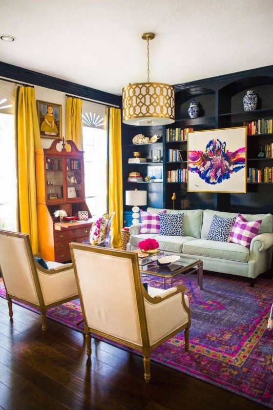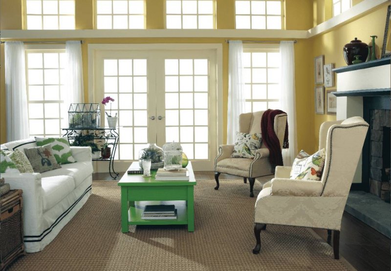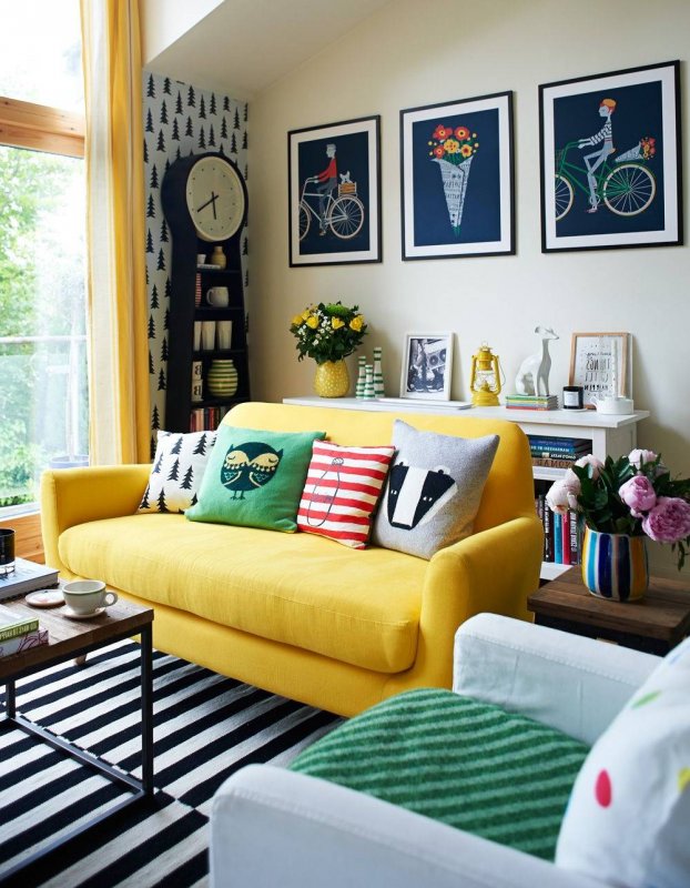 В гостиной желтый гармонирует с белым, оранжевым, синим, фиолетовым.