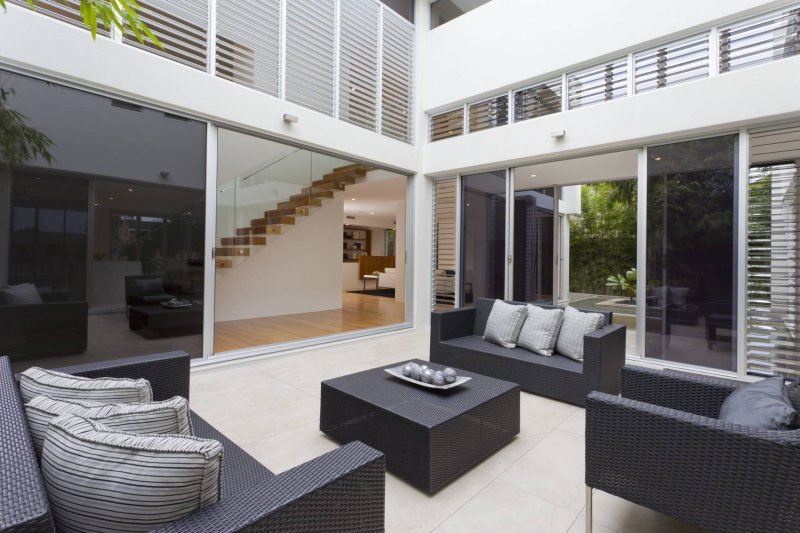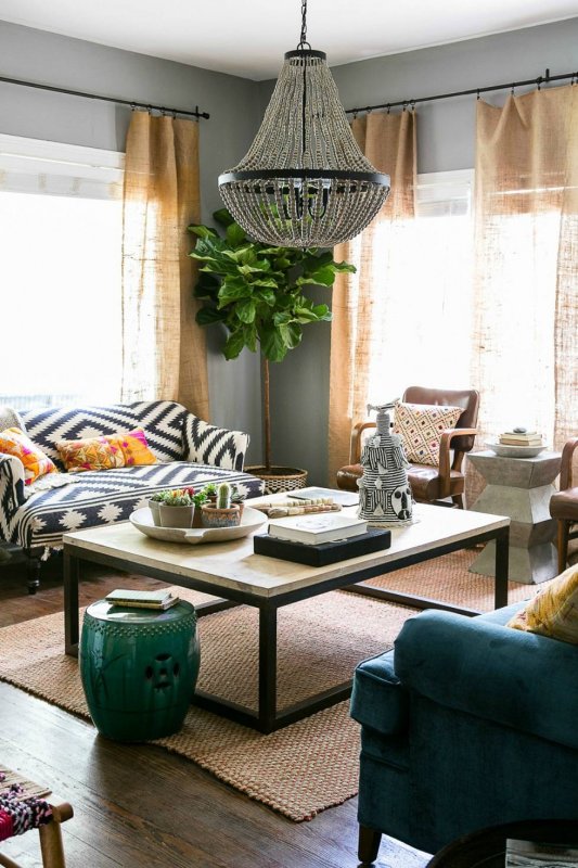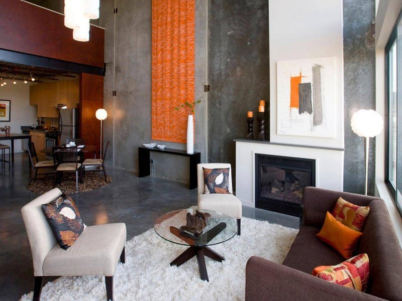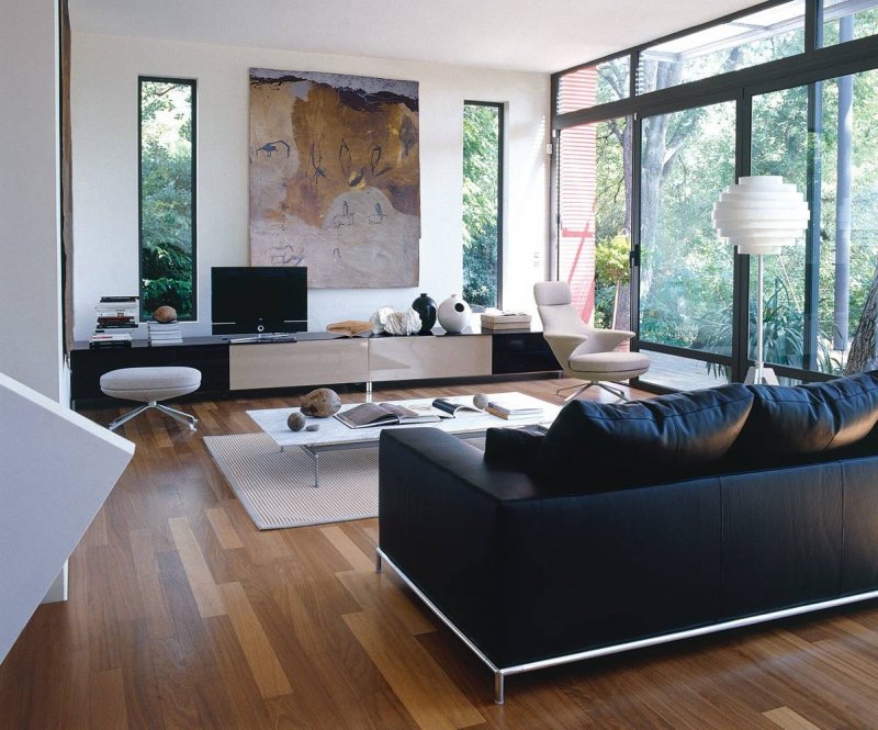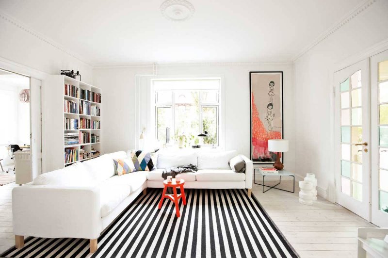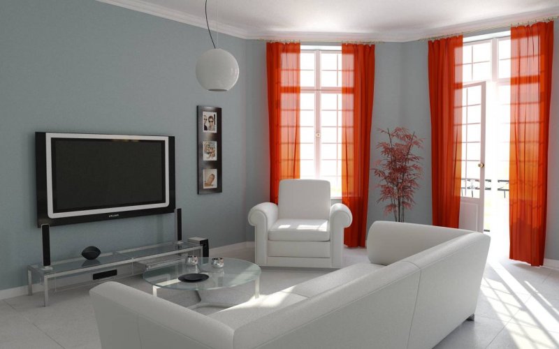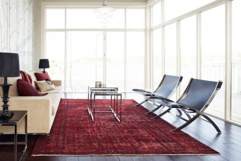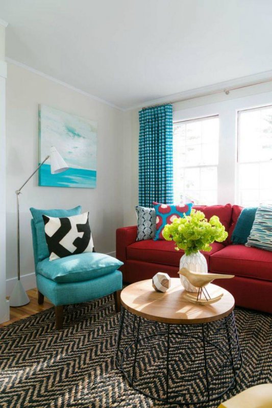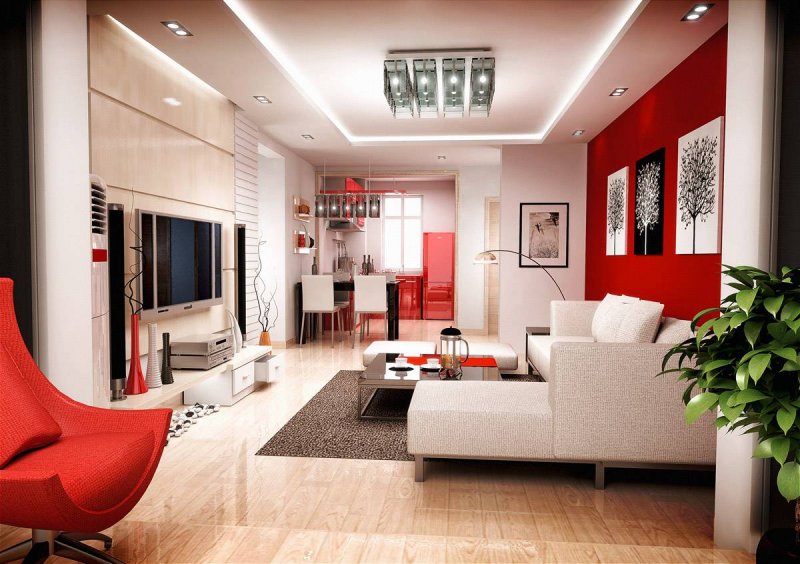 Главная комната будет выразительной, даже если красный использовать в качестве небольших вкраплений (небольшой ковер, шторы, подушки, диван).