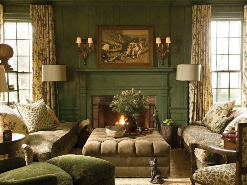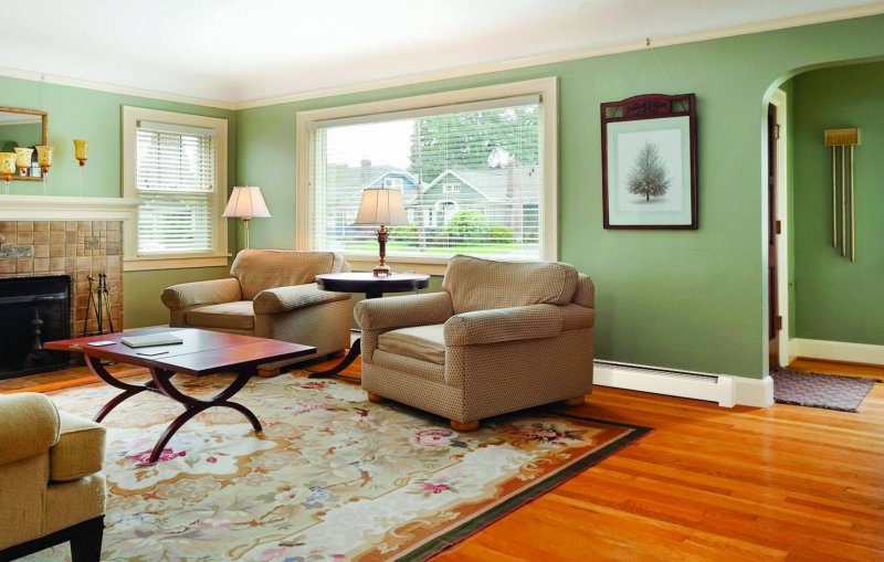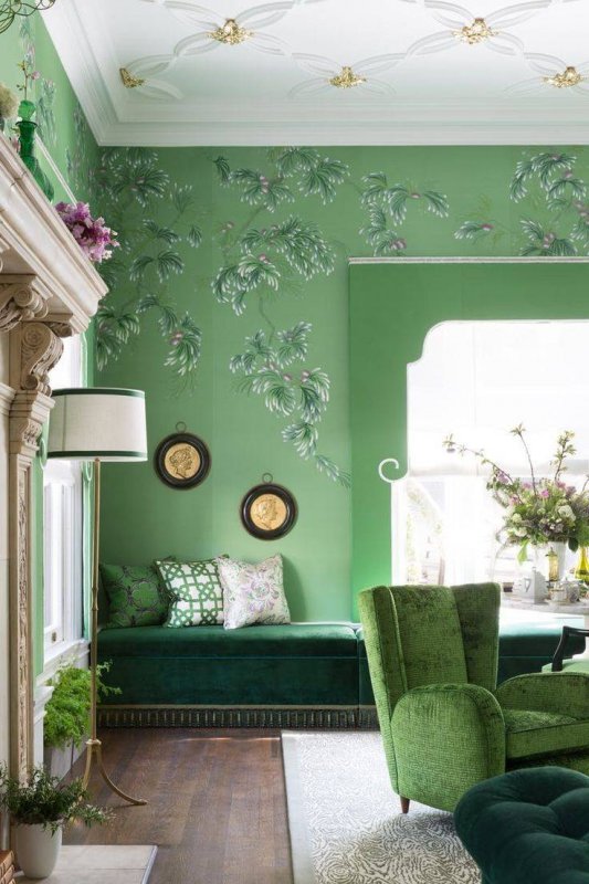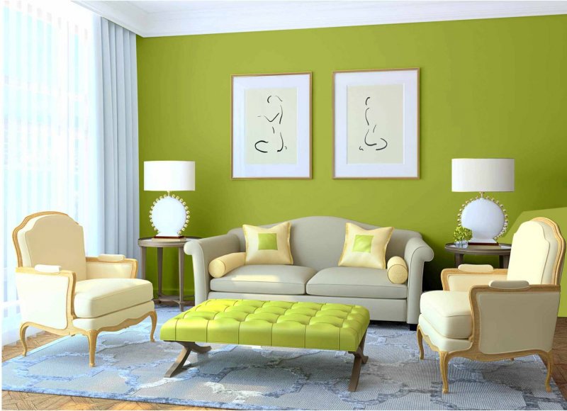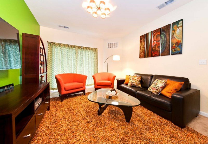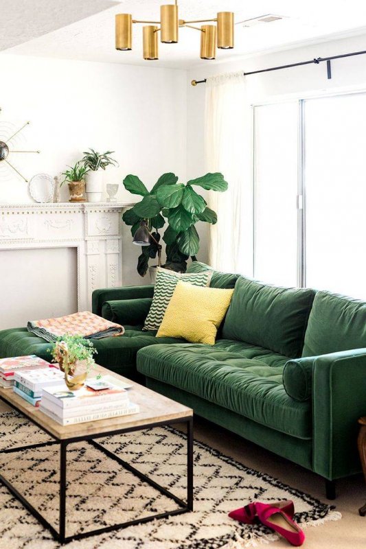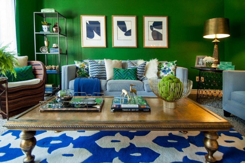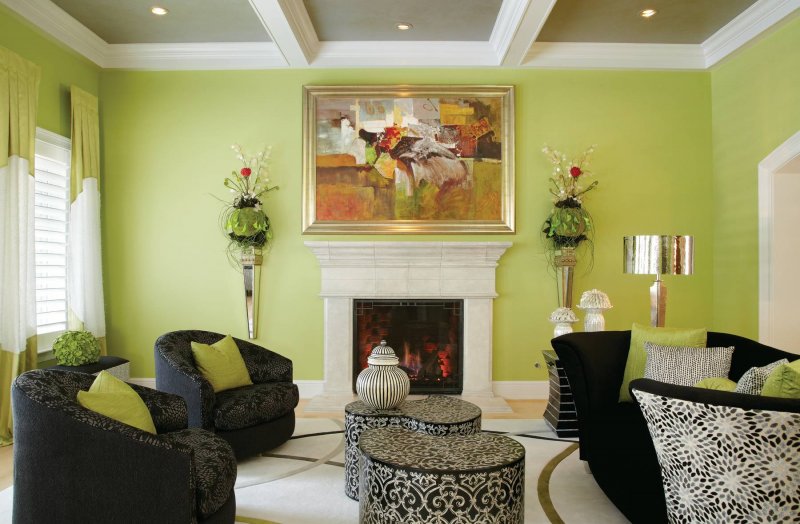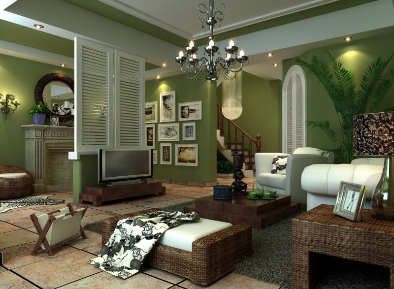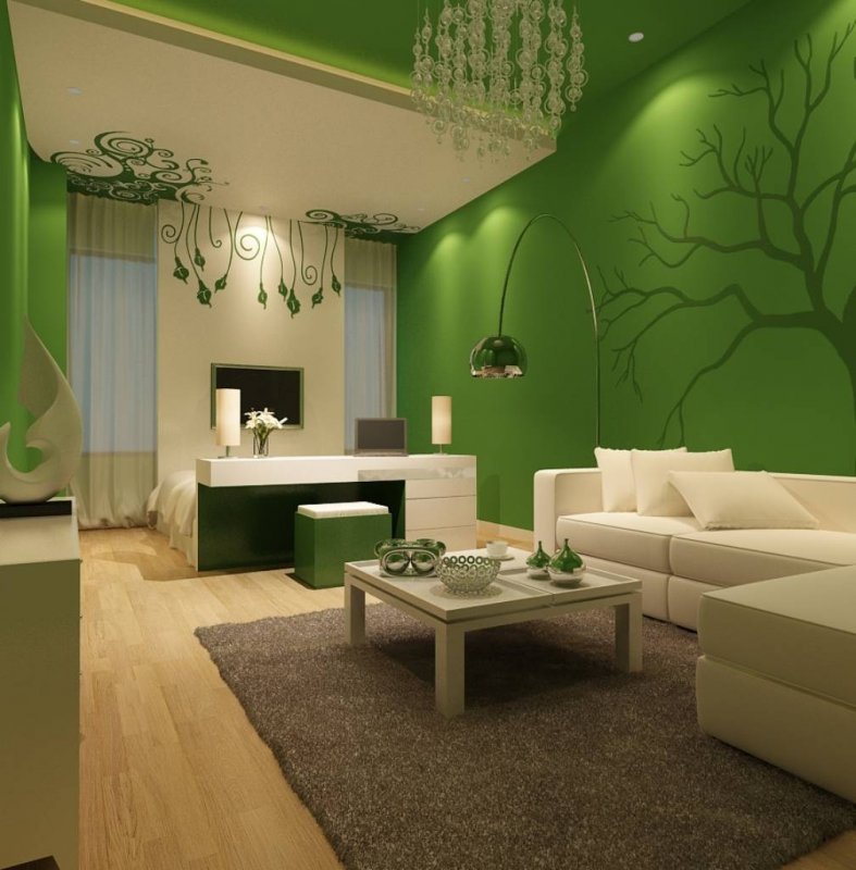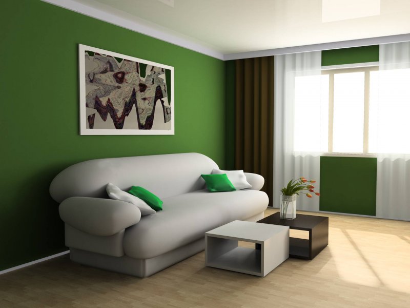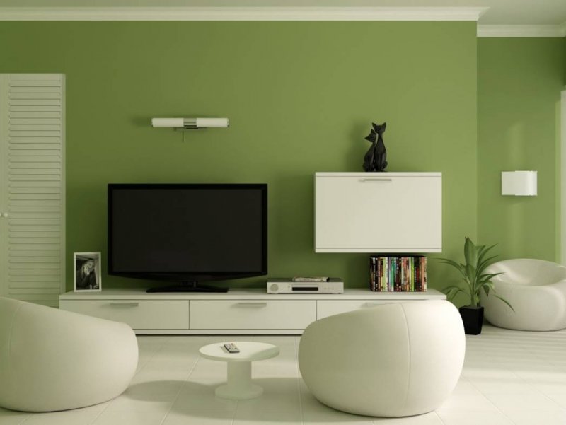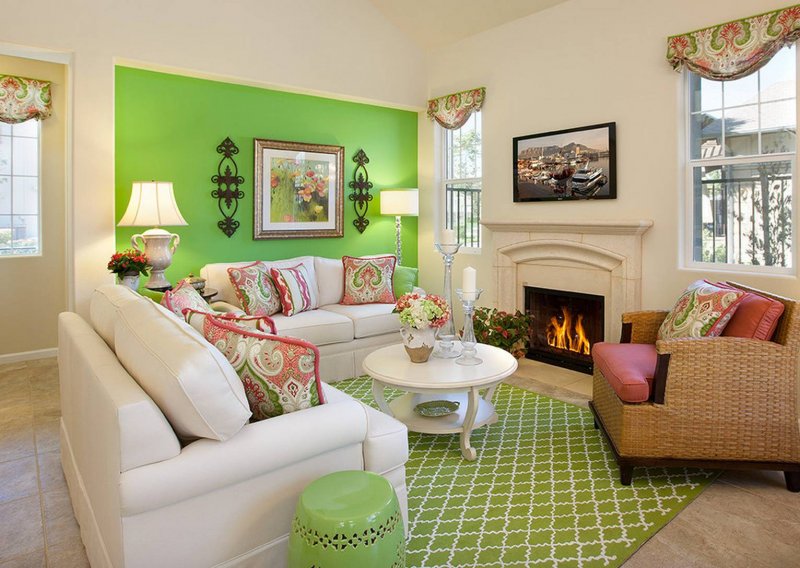 Приятный для зрения и успокаивающий естественный зеленый ассоциируется с флорой и ее красотами. Такой эффект можно умело задействовать в главном помещении дома, если сочетать зеленый с другими природными расцветками: все оттенки коричневого, бежевая гамма, песочные тона и оранжевые. Также гостиную в зеленых цветах дополнит белый и желтый.
