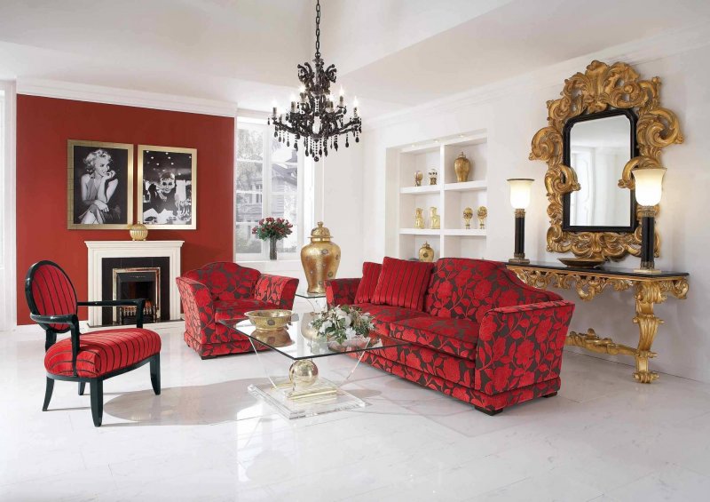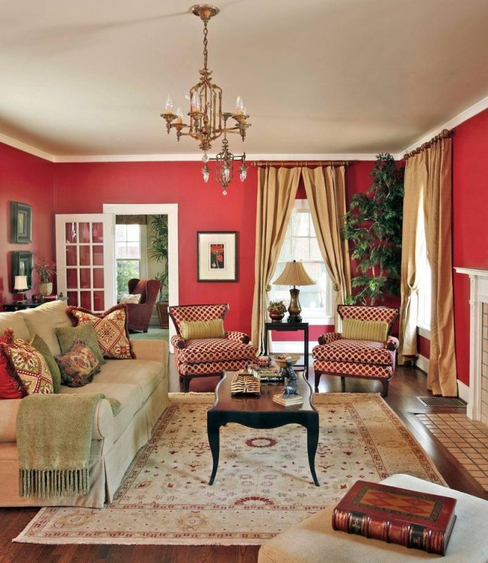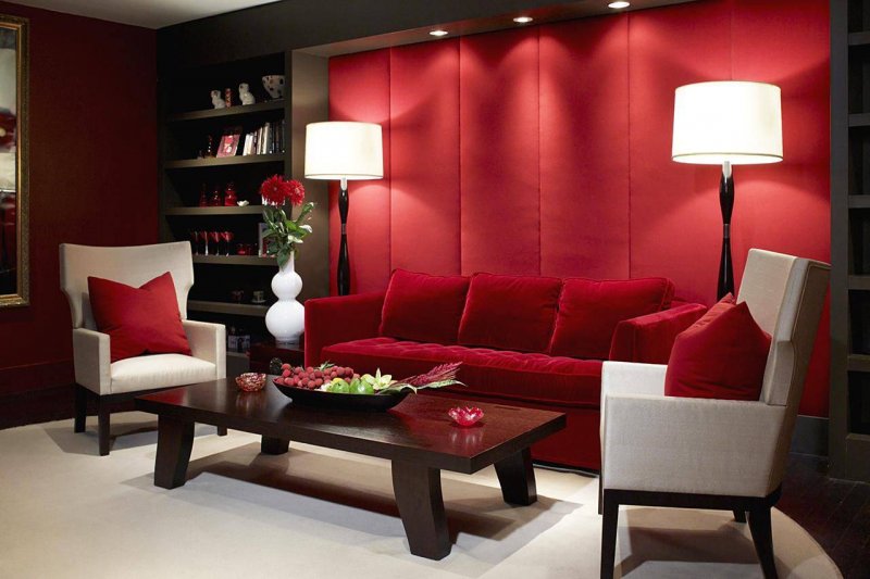 Гостиная в красных цветах нередко олицетворяет нрав хозяина: лидерство, властность, страсть. Красный будет подпитывать зарядом энергии всех, кому он нравится. В противном случае он может раздражать и перегружать зрение.