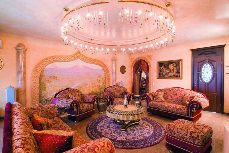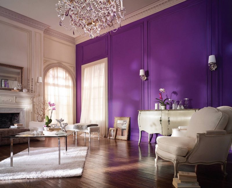 Благородный фиолетовый как нельзя лучше подчеркнет роскошь, шик и элегантность жилища. Не зря он еще с давних времен считается королевским. Если вы хотите оформить гостиную в фиолетовых цветах, подбирайте изысканную мебель, аксессуары и дорогой хрусталь.