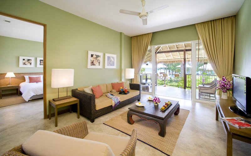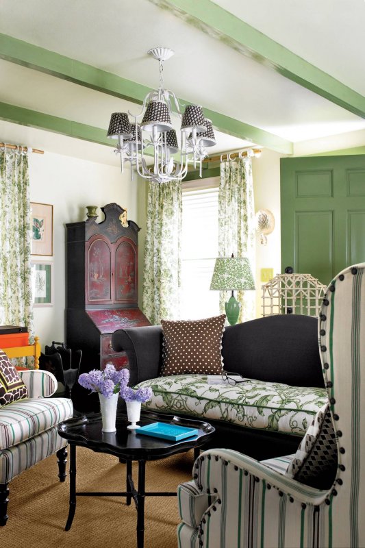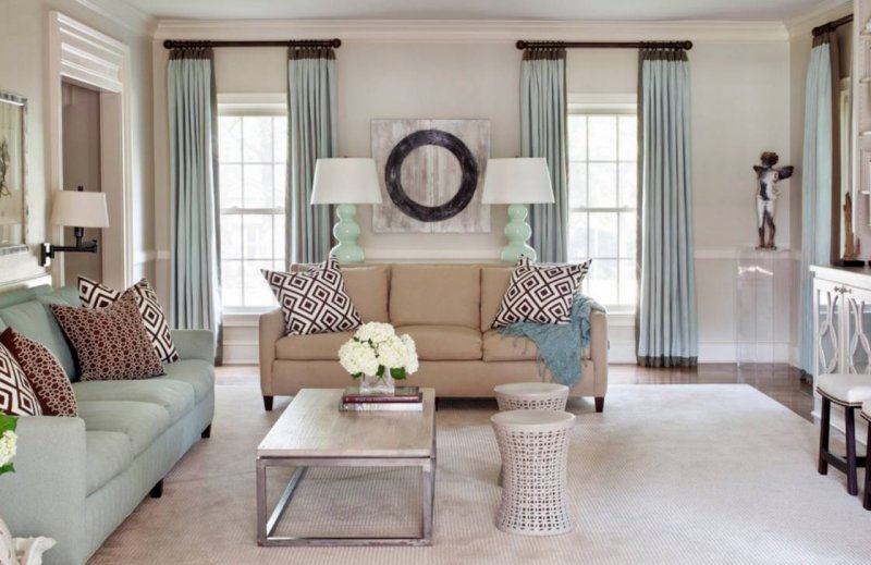 Пример таких пропорций: бежевый дополняет зеленый, а вкраплениями служит бирюзовый тон (шторы, декоративные подушки).