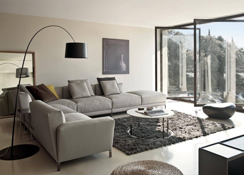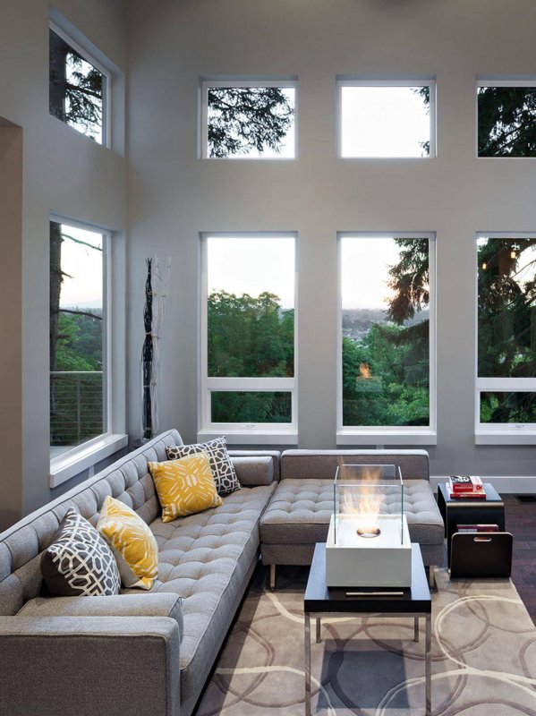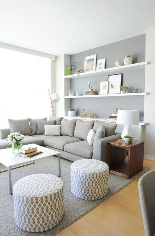 Гостиная в сером цвете выглядит весьма сдержано с ненавязчивой элегантностью. Серый целесообразен в светлых помещениях, но не стоит делать его доминирующим, чтобы обстановка не выглядела скучной.