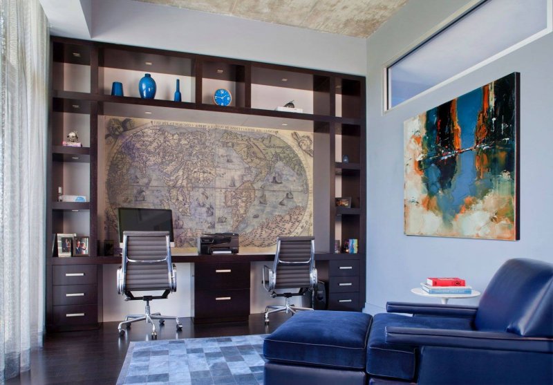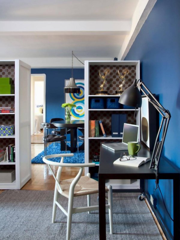 Кабинет в синих цветах насыщает энергией и решительностью его владельца и деловых партнеров. Целесообразно его задействовать в просторных и хорошо освещенных офисах. Синими могут быть стены, стулья, офисное кресло в сочетании с белым или бежевым потолком и коричневым полом. Также синий сочетается с голубым и венге.
