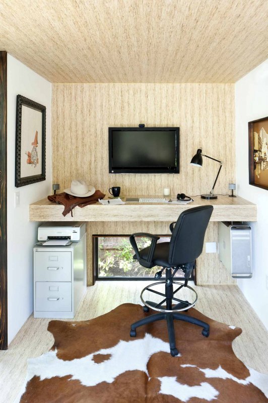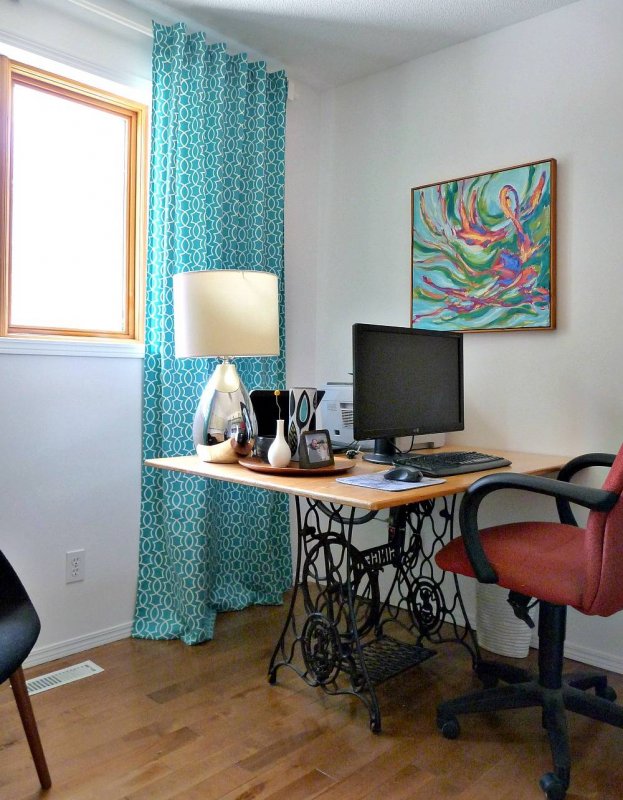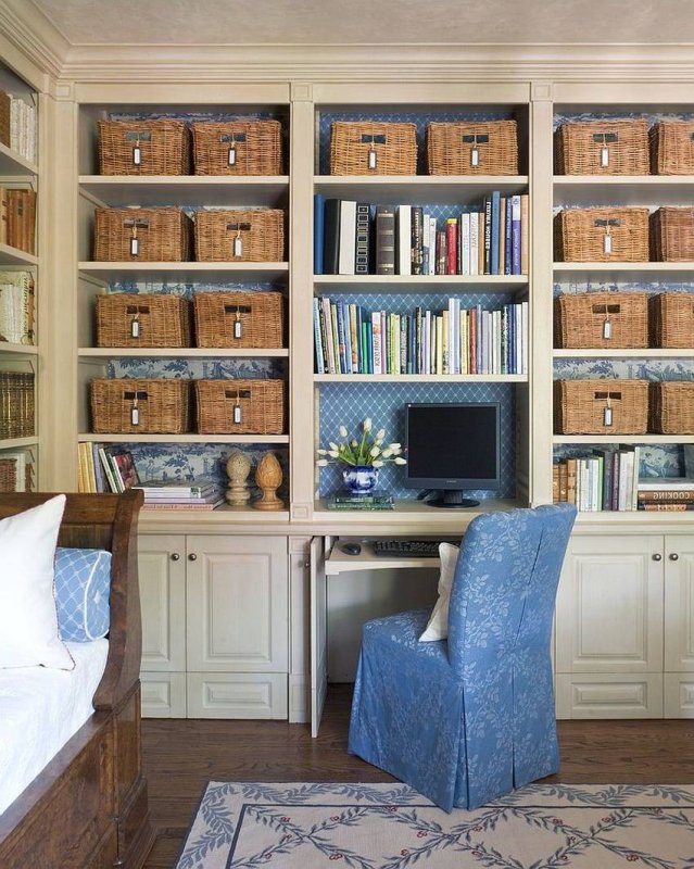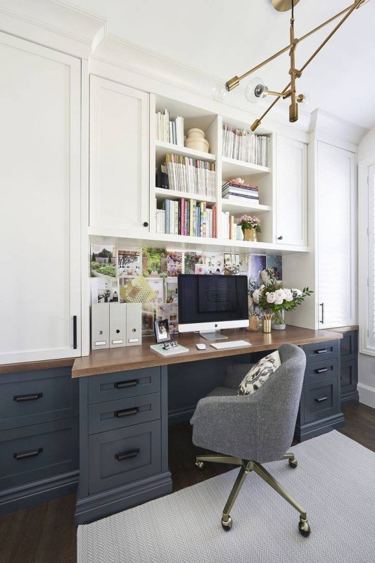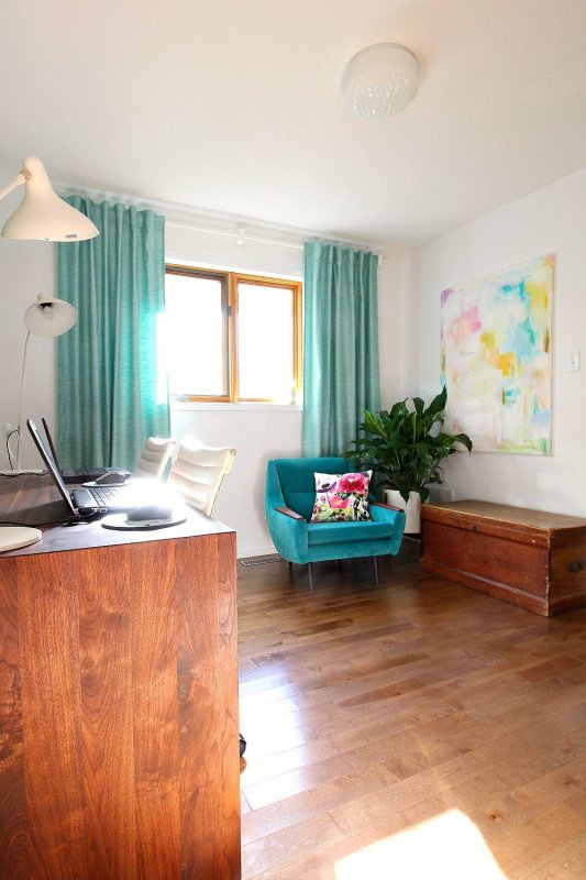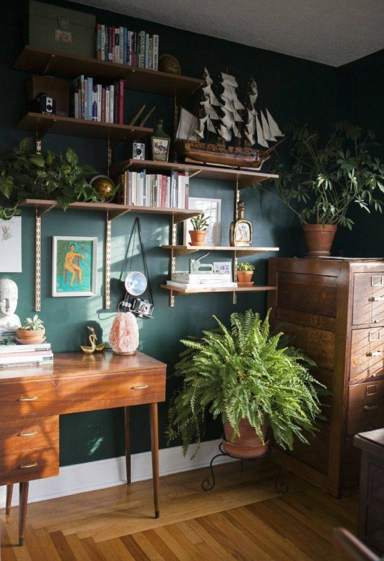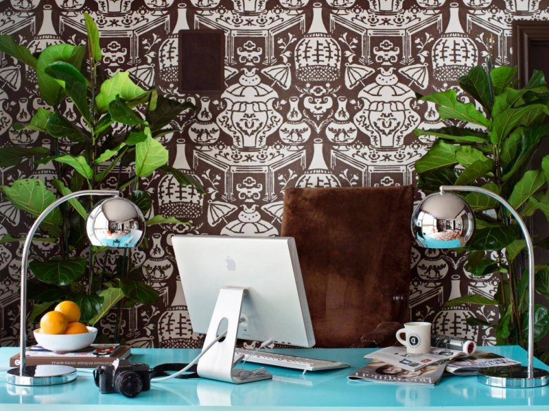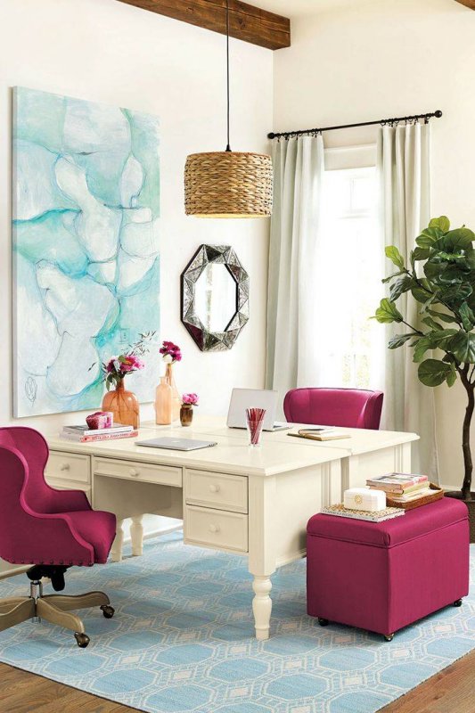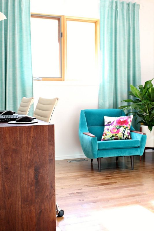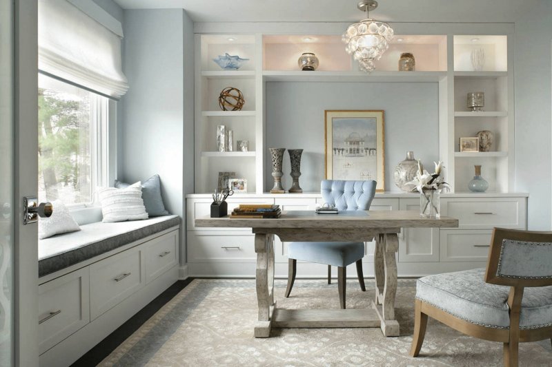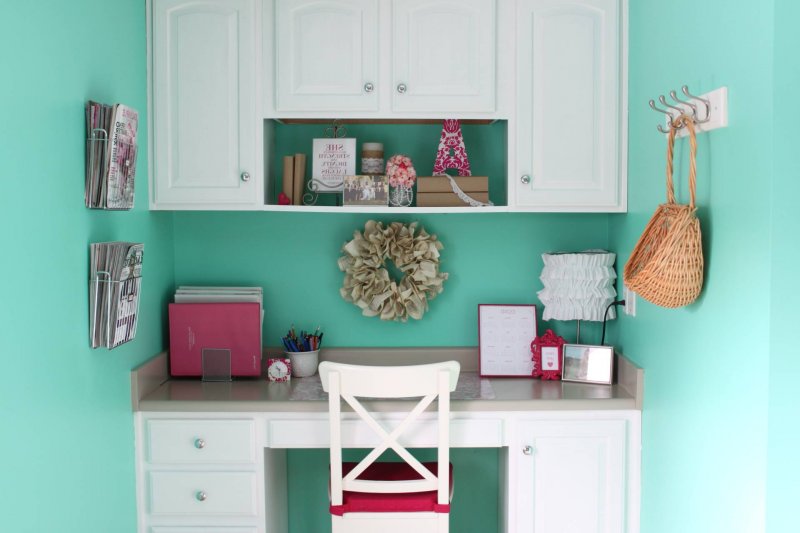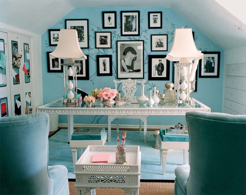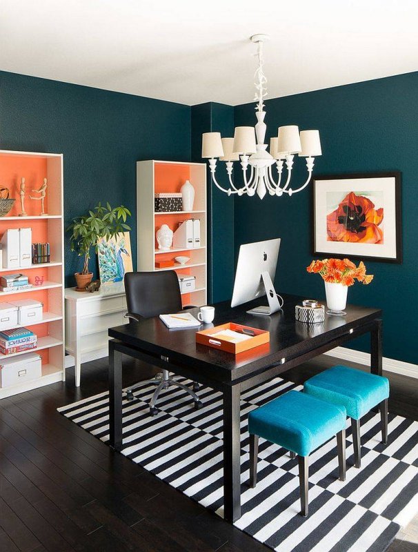 Кабинет в бирюзовых цветах – хорошее решение для творческих и активных людей. Он помогает им генерировать идеи и улучшает настроение. Но лучше не делать его главным или сильно насыщенным, чтобы он не начал утомлять.