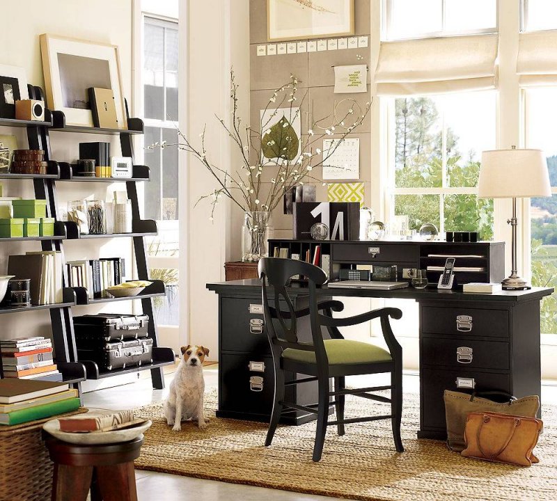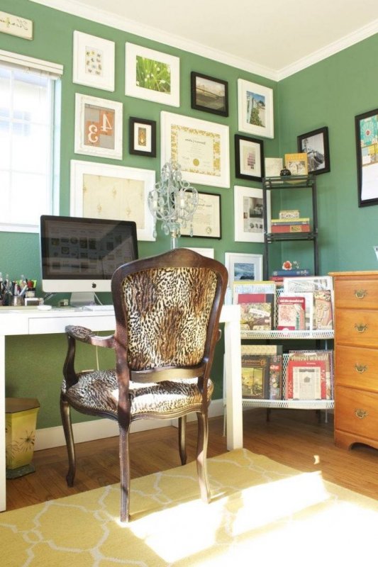 Зеленый довольно часто доминирует в личных офисах или используется в равноправной паре с другой расцветкой. В окружении естественного зеленого комфортно находиться, он ассоциируется с флорой и помогает увидеть "зеленый свет" в решении деловых вопросов.