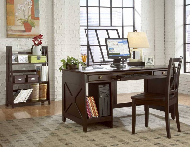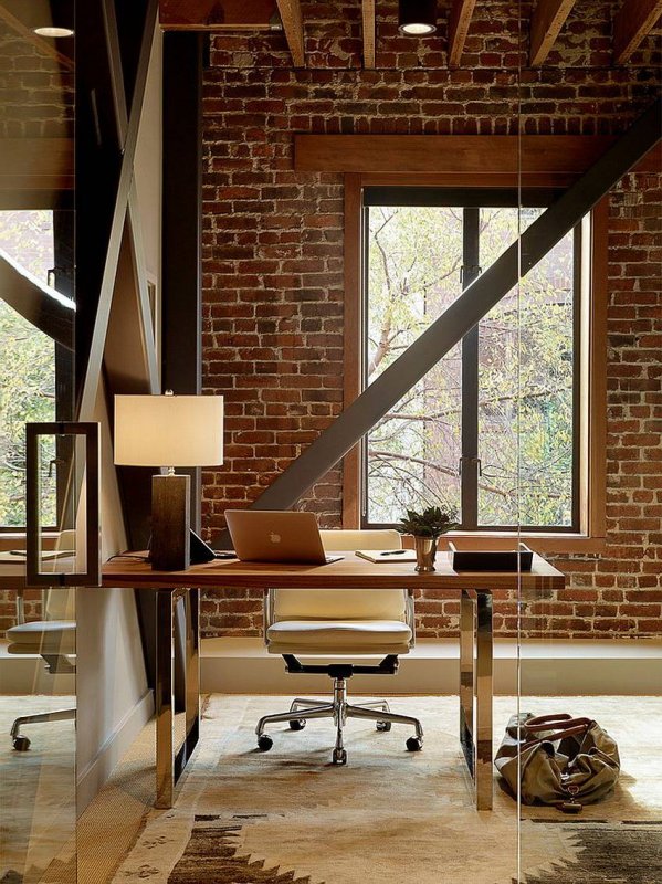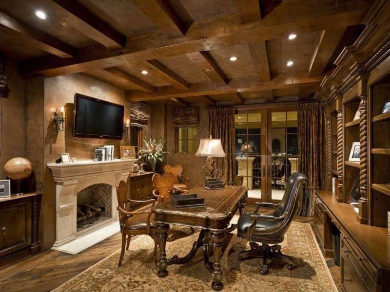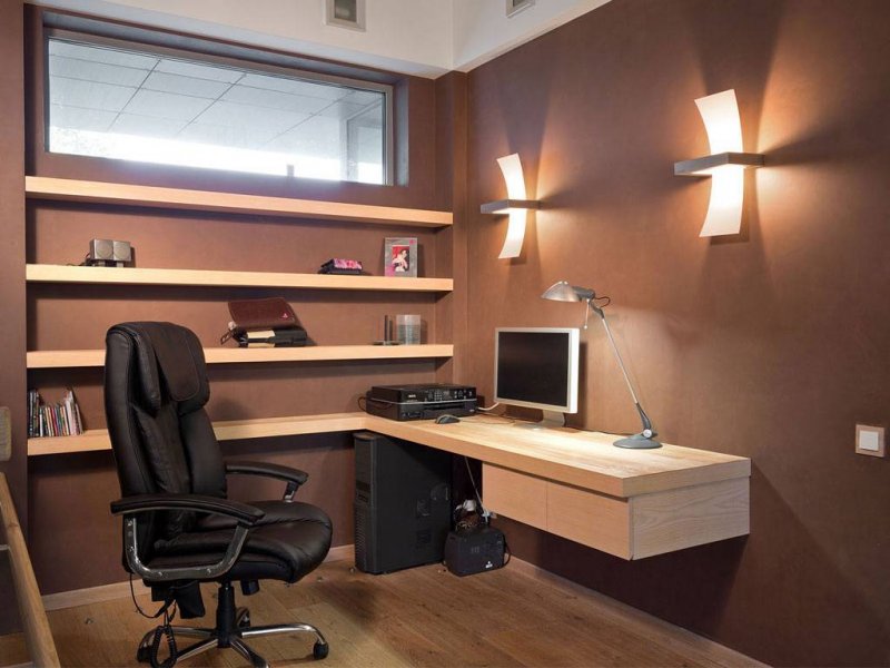 Умеренной насыщенности коричневый способствует концентрации на работе и дарит чувство комфорта. Сочетается коричневый с белым, всеми оттенками зеленого и голубым. Также эффектно будет смотреться кабинет в разных оттенках коричневого.