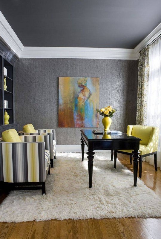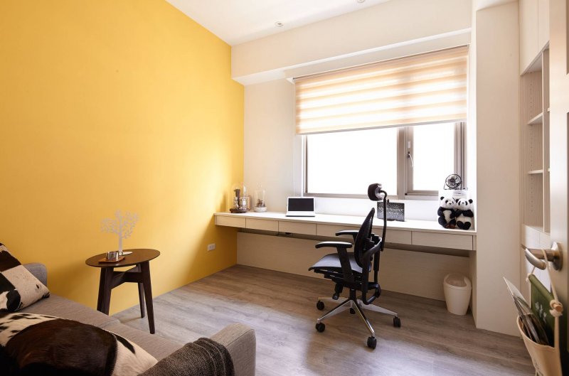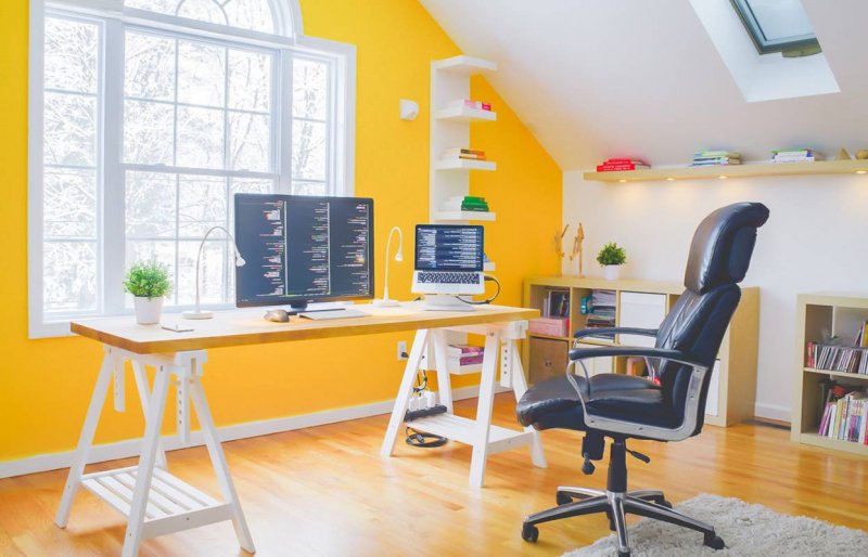 Дизайн кабинета цвета солнца – актуальное решение для молодых, креативных и энергичных людей. Желтый способен разрядить обстановку и внести положительные эмоции, особенно, если он дополнен интересными фактурами. Расцветка проявит себя, даже если будет выражена в мебели, шторах и ковре. Сочетания: зеленый, белый, светло-серый, черный.