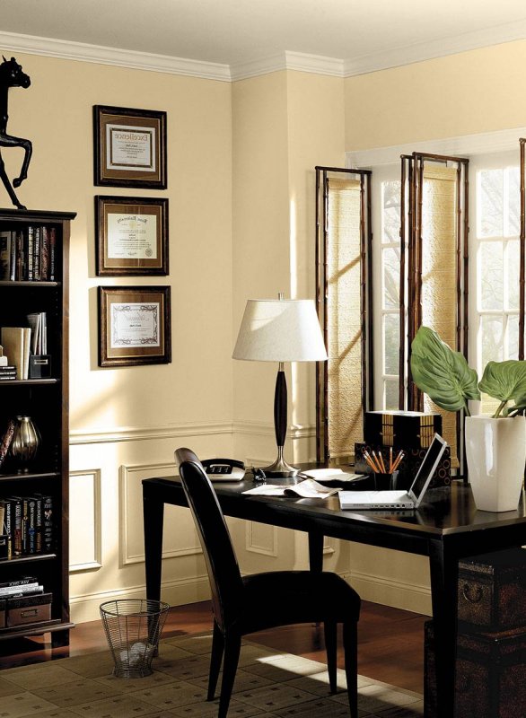 Если это основная расцветка, рекомендуется добавить яркие вкрапления другого цвета (шторы, стулья, небольшой ковер). Гармонирует бежевый в офисе с коричневым, голубым, черным и персиковым.